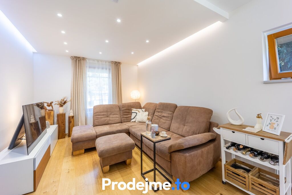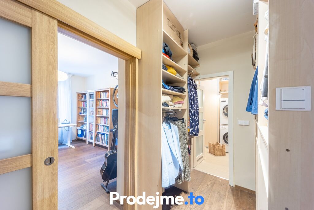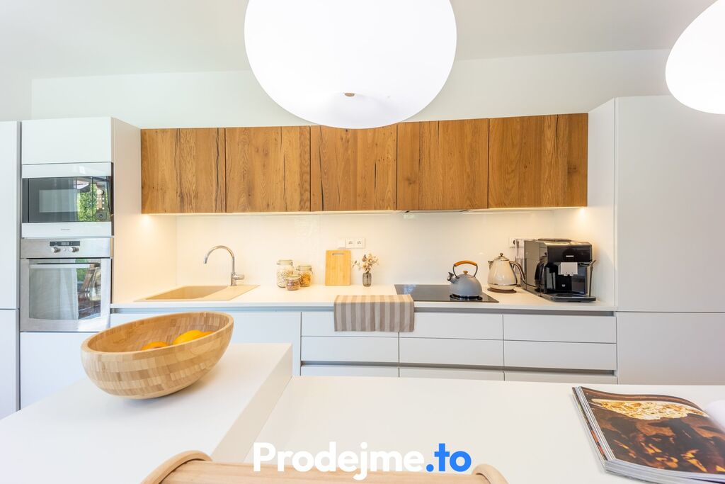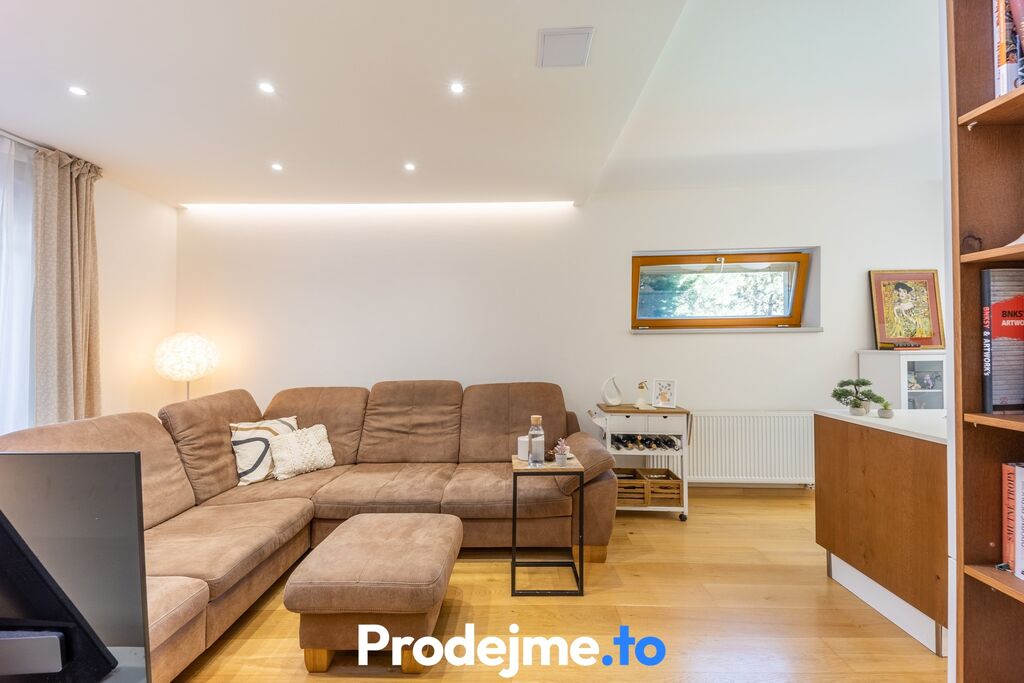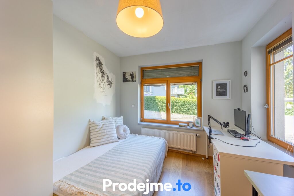 Jako celek ale funguje skvěle, uznejte sami. Vše začíná v obývacím pokoji s velkou kuchyňskou linkou a ostrůvkem. Díky francouzským oknům a vstupům na terasu i do předzahrádky je celý prostor naplněný sluncem. Příjemnou atmosféru díky dostatku denního světla si užijete také v dětském pokoji a ložnici. V té vás potěší vlastní vstup na terasu. Klid na práci vám dopřeje pracovna, kterou ale můžete v případě potřeby snadno využít jako další dětský pokoj. Vkusná koupelna disponuje 2 umyvadly, sprchou a rohovou vanou. Pračku se sušičkou a potřebami pro úklid umístíte do praktické komory. Toalety jsou k dispozici dvě.