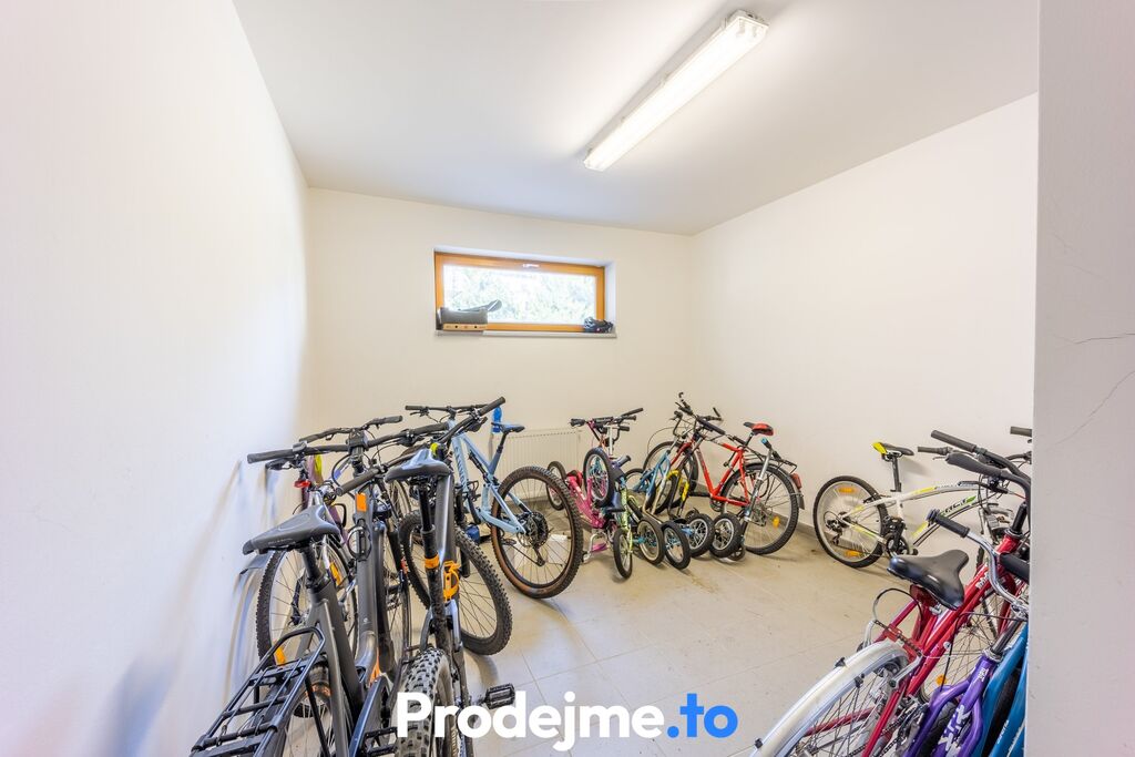 Úložné prostory zajišťují vestavěné skříně. Další nezbytnosti uložíte ve vlastním sklepě o velikosti 2 m2. Ten je navíc umístěný přímo vedle vašeho vlastního garážového stání. K dispozici je i společná kolárna.