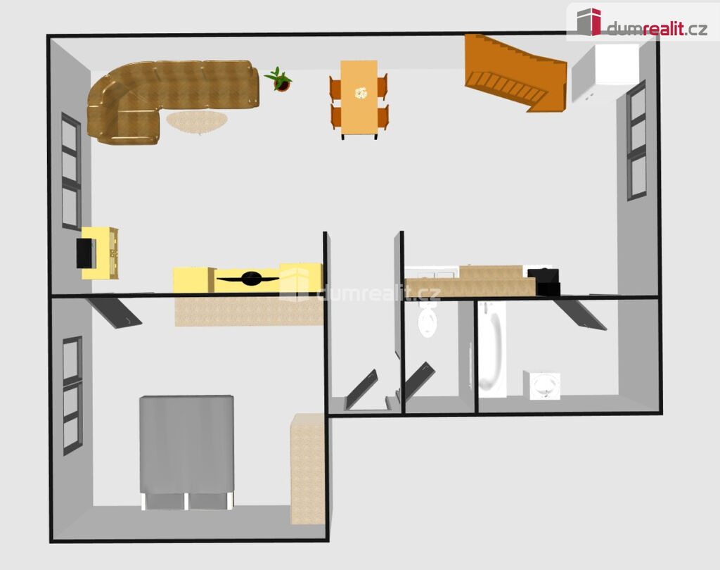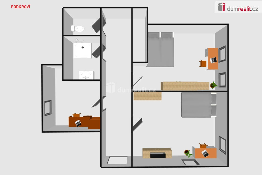 Dispozičně je byt řešen následovně: zádveří, samostatné WC, koupelna, kuchyně 16,5m², obývací pokoj 17m², ložnice 15m², dále se schodištěm z kuchyně přijde do podkroví, které disponuje centrální chodbičkou s klimatizací, pokojem 15m², pokojem 16m², šatnou či technickou místností 8m², koupelnou se sprchovým koutem a samostatným WC.
