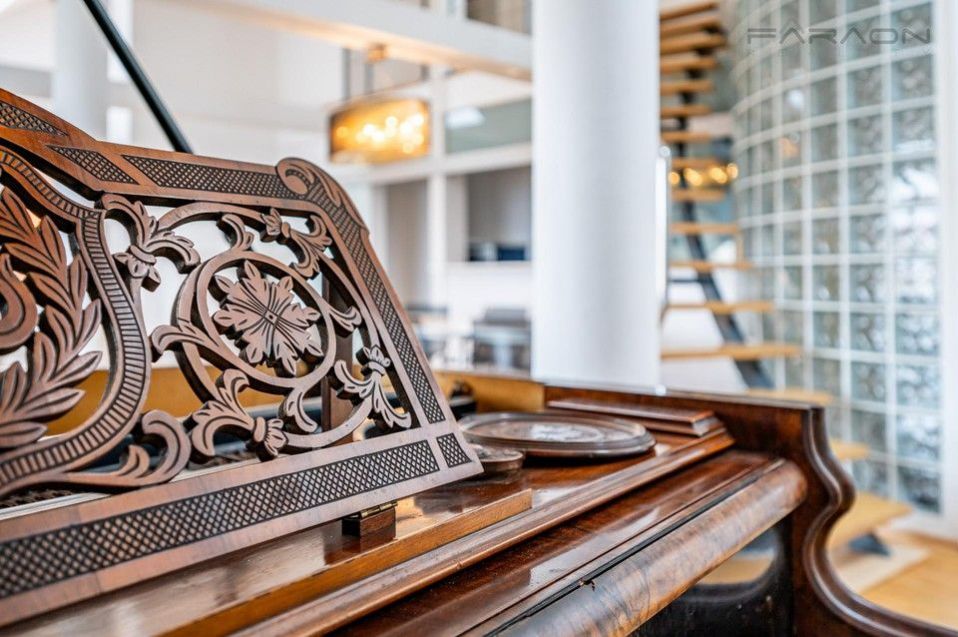 Dispozici tvoří: prostorný obývací pokoj (74 m2) s velkým oknem a výhledem na řeku, samostatná plně vybavená kuchyň oddělená skleněnou posuvnou příčkou, 4 oddělené ložnice, (z nichž 3 jsou situovány v patře, v klidové zóně mezonetu), 3 koupelny s vanou, sprchou a bidetem, 2 šatny, komora, prádelna s pračkou, vstupní hala a střešní terasa. Terasa je orientovaná do klidného vnitrobloku a navazuje na zimní zahradu. Dřevěná podlaha, kvalitní dřevěná okna, dlažba.