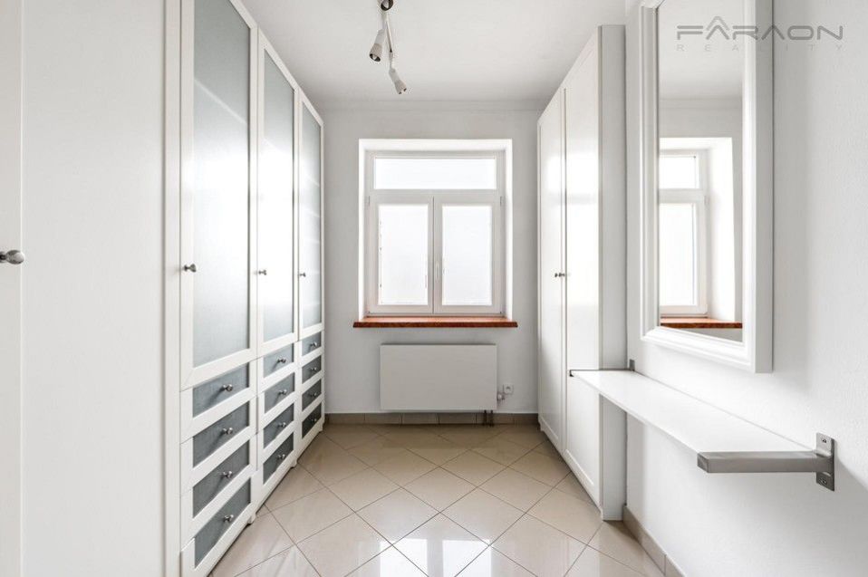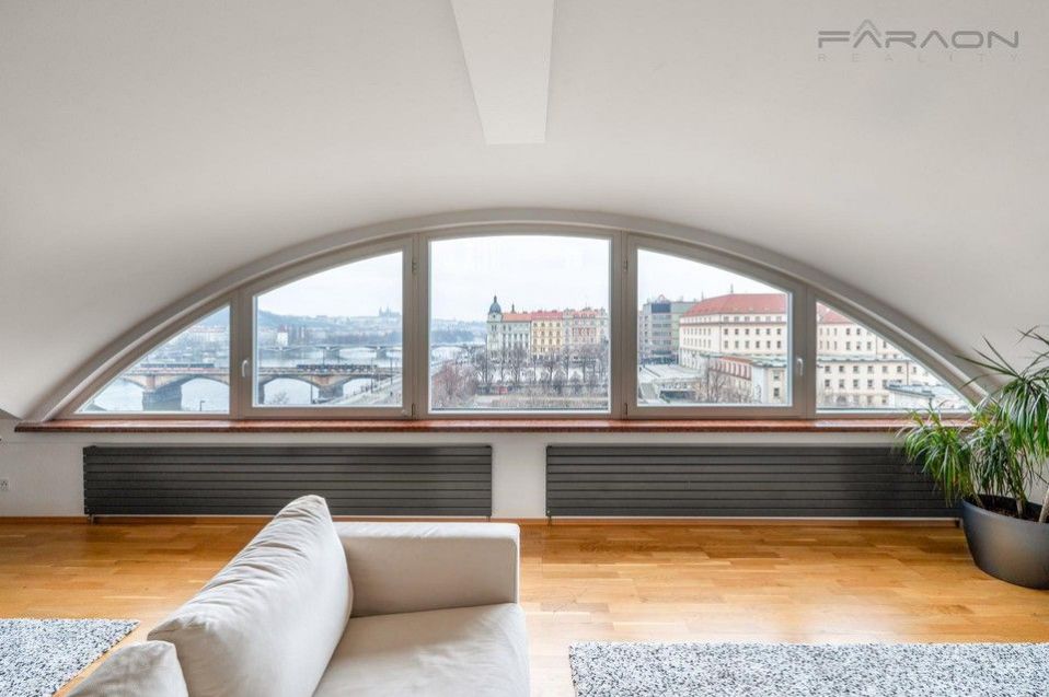 K pronájmu luxusní dvoupatrový byt 5+kk, 250 m2 s terasou a zimní zahradou, s nádherným výhledem na řeku Vltavu, Pražský Hrad a Petřín, v 6. a 7. patře kompletně zrekonstruované historické secesní budovy s výtahem v blízkosti nábřeží, pár minut od Palackého náměstí a Karlova náměstí, v ulici Dřevná, Nové Město, Praha 2.