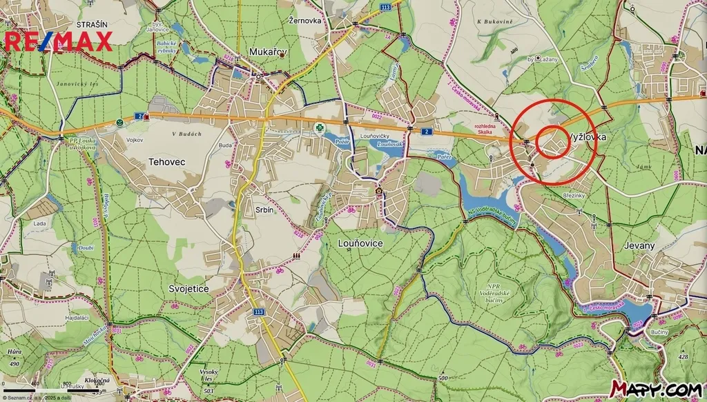 Kompletní občanská vybavenost v dosahu - v obci je základní občanská vybavenost (několik restaurací, vyhlášená pizzerie Vyžlovka, večerka, škola prvního stupně a další. V sousedních Louňovicích nová škola - otevřená tento rok). Známé koupaliště je 900 m od domu. Kompletní občanská vybavenost je v Kostelci n.Č.l. - obchody, lékárny, banky, doktoři, škola a školky, zájmové, kulturní i sportovní kroužky pro děti i dospělé a další.