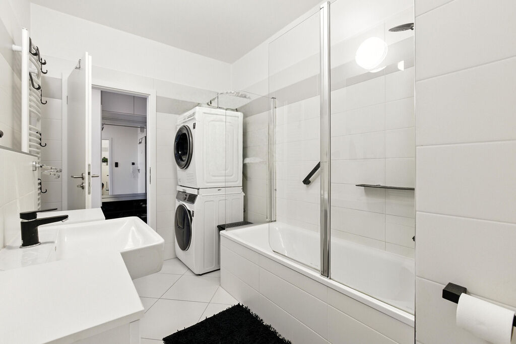 Byt se nachází v 5. patře z celkových 7 a obytnou plochu tvoří předsíň s vestavěnou skříní (botníkem) a prostornou technickou místností, obývací pokoj s kuchyňským koutem na míru včetně kvalitních spotřebičů značky Bosch a AEG, ložnice se vstupem na balkón a koupelna s vanou a WC.