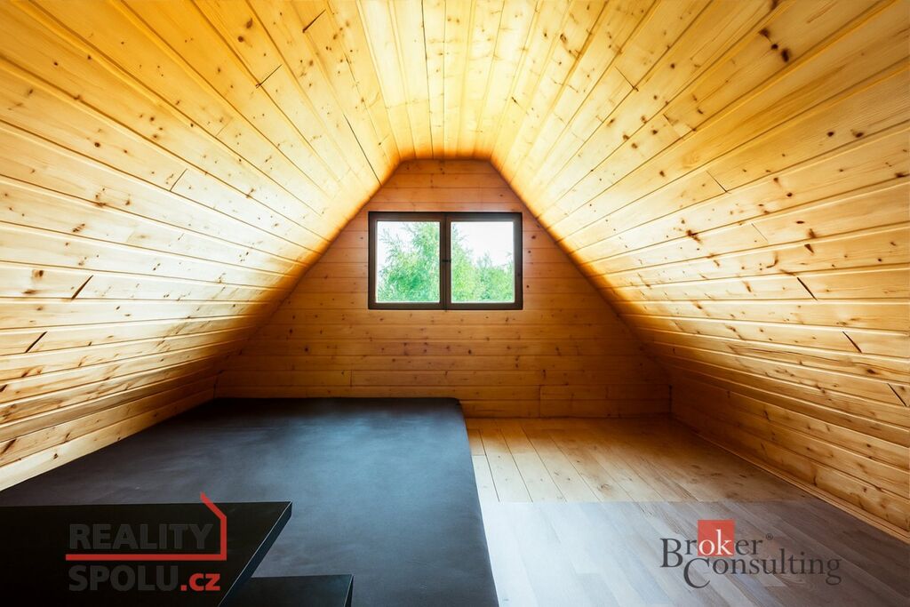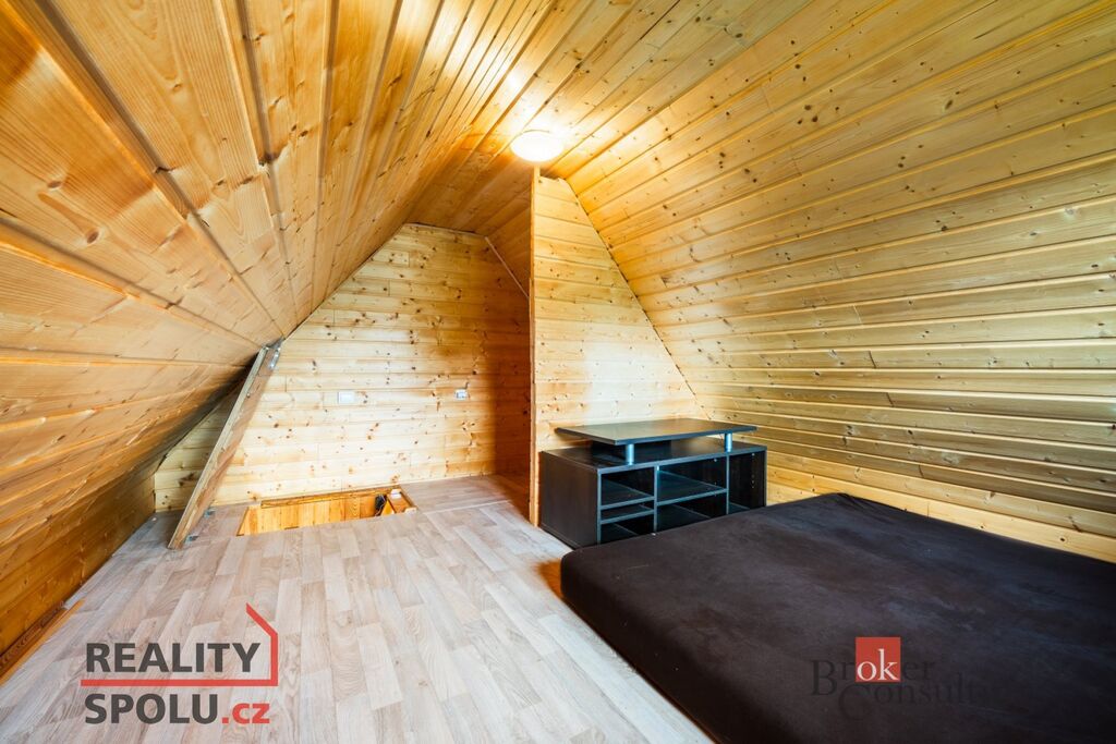 Hlavní obytná místnost s možností vstupu do patra, které slouží jako přespávací prostor (podkroví s nižší výškou stropu pod skosenou střechou).
