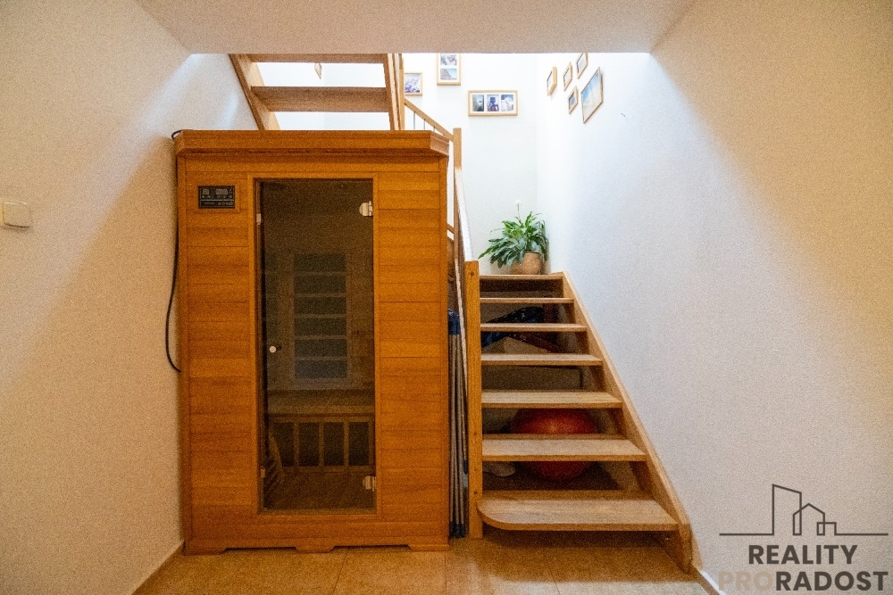 Nabízíme vám exkluzivně ke koupi krásný rodinný dům v obci Staré Hrady, nacházející se nedaleko města Jičín. Dům byl postaven v roce 2010. Jedná se o zděnou stavbu se zastavěnou plochou a nádvořím 165 m2. Za domem se nachází terasa a velká udržovaná zahrada s ovocnými stromy o ploše 1450 m2, kterou protéká malý potůček. Tato zahrada, částečně osázená vysokými stromy, je velmi působivá a splňuje vysoké nároky na relaxaci v klidném prostředí. Dům není podsklepen, má 3 podlaží, z toho jedno podlaží je půdní prostor. Topení je plynovým kotlem Viessmann a také krbem na tuhá paliva obloženým z mastku - 4 h výdrž tepla po vyhasnutí. Ohřev vody zajišťuje plynový bojler. V přízemí podlahové topení, v patře radiátorové vytápění kromě koupelny a WC, kde je rovněž podlahové topení. V přízemí se nachází předsíň, chodba, kuchyň s jídelnou, špajzka, obývací pokoj, koupelna se sprchovým koutem a WC, síň se saunou, zimní zahrada, technická místnost s prádelnou a garáž. V patře se nachází předsíň, ložnice, dětský pokoj, obývací pokoj s kuchyní a balkonem, WC, koupelna s vanou a sprchovým koutem. Vodovod obecní, odpady septik. V každé s kuchyní je myčka, sporák indukce, digestoř, lednice s mrazákem. V kuchyni v přízemí je trouba vestavěná. Dům má centrální vysavač, žaluzie, předokenní rolety. Internet - wifi. Před domem je možno na vlastním pozemku parkovat navíc až 3 auta. Střecha sedlová, střešní krytina Bramac, termofasáda 10 cm, okna plastová dvojskla, podlaha marmoleum click v imitaci parket. Dům si můžete celý prohlédnout ve video prohlídce a interiér v 3D 360 °prohlídce, stačí kliknout na fotku, kde je napsáno spustit prohlídku. Pokud by se vám to nezobrazilo nebo realitní server prohlídku nepodporuje, napište mi a já vám pošlu rád odkaz. V obci Staré Hrady se nachází zámek, hrad, restaurace. Autobusová zastávka je cca 100 m od domu a vzdálenost od městečka Libáň je 1 km, kde je školka, škola, pošta, restaurace, obchody. V okolí obce je spousta turisticky zajímavých míst - Prachovské skály, zámek Dětenice , Šolcův statek, hrad Kost, Vilémův mlýn a další. V okolí jsou cyklostezky a běžkařské stopy. Města v okolí jsou vzdálená - 15 km Jičín, Mladá Boleslav 27 km, Nymburk 30 km, Poděbrady 36 km, Praha Černý Most 70 km. Doporučuji vám vřele prohlídku a možnost výhodnějšího hypotečního financování koupě prostřednictvím profesionálního finančního partnera. PENB je třída B, velmi úsporná.