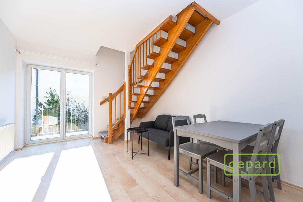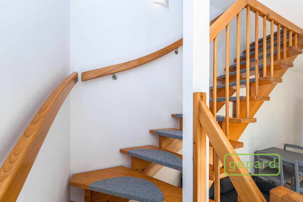 Celková plocha bytu činí 59 m2 včetně terasy (5,5 m2) a balkonu (2,5 m2). Byt je situován v 1. patře a v podkroví cihlového domu z roku 2006. Ve spodním patře bytu je obývací pokoj s kuchyňským koutem a vstupem na balkon (orientovaný na jihovýchod), předsíň a koupelna s toaletou. V horním patře je ložnice, pracovna kombinovaná se šatnou a koupelna s vanou. Z ložnice vede vstup na terasu, která je směrována na severozápad. V obytných místnostech je plovoucí podlaha, v předsíni a v koupelně je dlažba. Schody jsou dřevěné s protiskluzovými nášlapy. Na oknech jsou dvojité garnýže. Byt je z větší části vybaven nábytkem a spotřebiči, jak je znázorněno na fotografiích. Součástí pronájmu je vybavení uvedené zde v textu. Kuchyňská linka obsahuje vestavnou lednici, sklokeramickou varnou desku, elektrickou pečící troubu a digestoř a dále volně stojící mikrovlnnou troubu. V obývacím pokoji je k dispozici jídelní stůl se 4 židlemi a pohovka, v ložnici rám postele 200x180 cm včetně roštů a komoda a v pracovně trojdílná šatní skříň. V předsíni je botník se zrcadlem. V koupelnách je koupelnový nábytek a ve spodní koupelně je pračka. Nájemce může využívat společnou zahradu u domu. Parkovat lze volně na ulici.