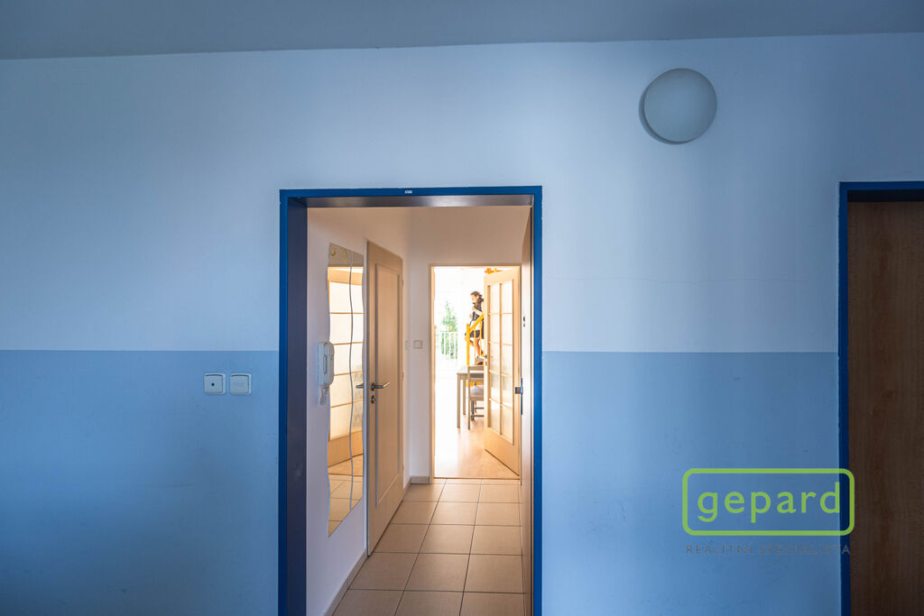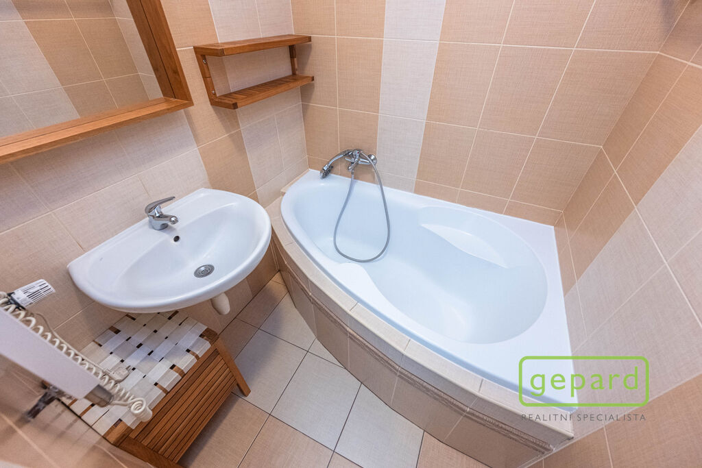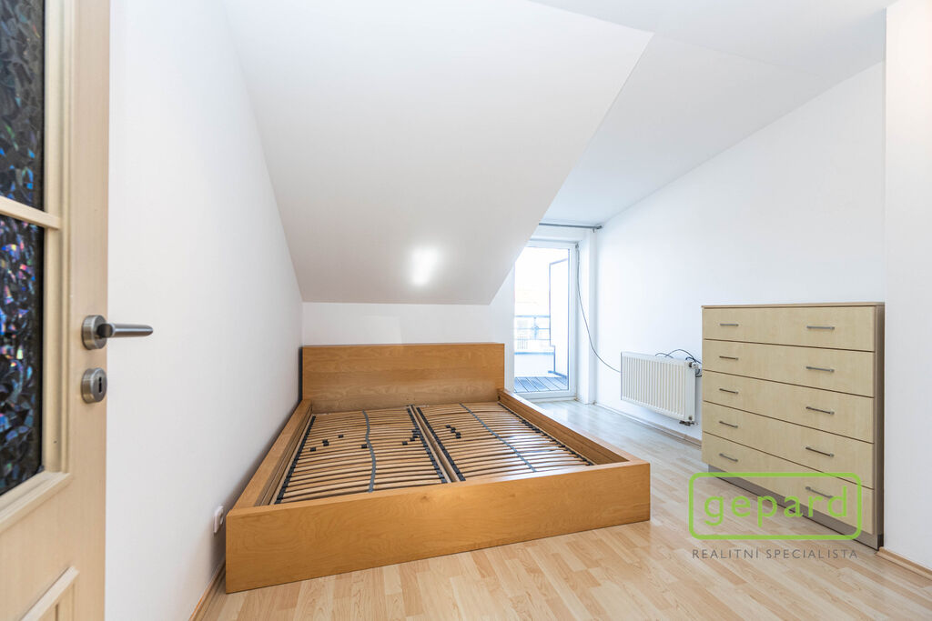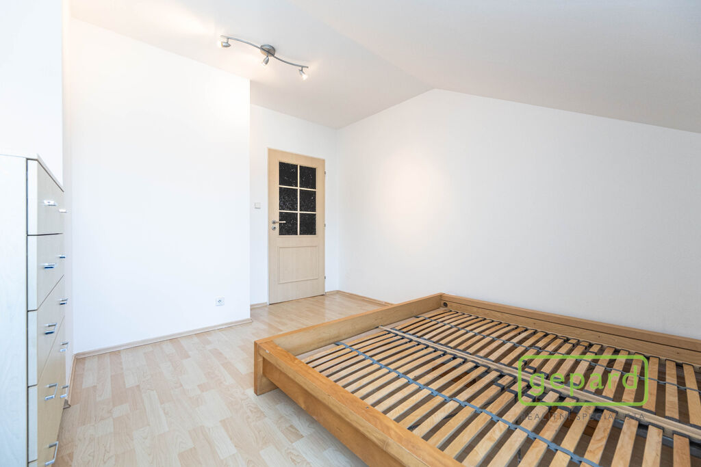 Celková plocha bytu činí 59 m2 včetně terasy (5,5 m2) a balkonu (2,5 m2). Byt je situován v 1. patře a v podkroví cihlového domu z roku 2006. Ve spodním patře bytu je obývací pokoj s kuchyňským koutem a vstupem na balkon (orientovaný na jihovýchod), předsíň a koupelna s toaletou. V horním patře jsou dva pokoje a koupelna s vanou. Z většího pokoje vede vstup na terasu, která je směrována na severozápad. V obytných místnostech je plovoucí podlaha, v předsíni a v koupelně je dlažba. Schody jsou dřevěné s protiskluzovými nášlapy. Na oknech jsou dvojité garnýže. Byt je z větší části vybaven nábytkem a spotřebiči, jak je znázorněno na fotografiích. Součástí pronájmu je vybavení uvedené zde v textu. Kuchyňská linka obsahuje vestavnou lednici, sklokeramickou varnou desku, elektrickou pečící troubu a digestoř a dále volně stojící mikrovlnnou troubu. V obývacím pokoji je k dispozici jídelní stůl se 4 židlemi a pohovka, v pokoji trojdílná šatní skříň a v ložnici rám postele 200x180 cm včetně roštů a komoda. V předsíni je botník se zrcadlem. V koupelnách je koupelnový nábytek a pračka. Nájemce může využívat společnou zahradu se zahradním sezením. Parkovat lze volně na ulici, případně je možné zprostředkovat pronájem parkovacího stání na oploceném parkovišti u domu.
