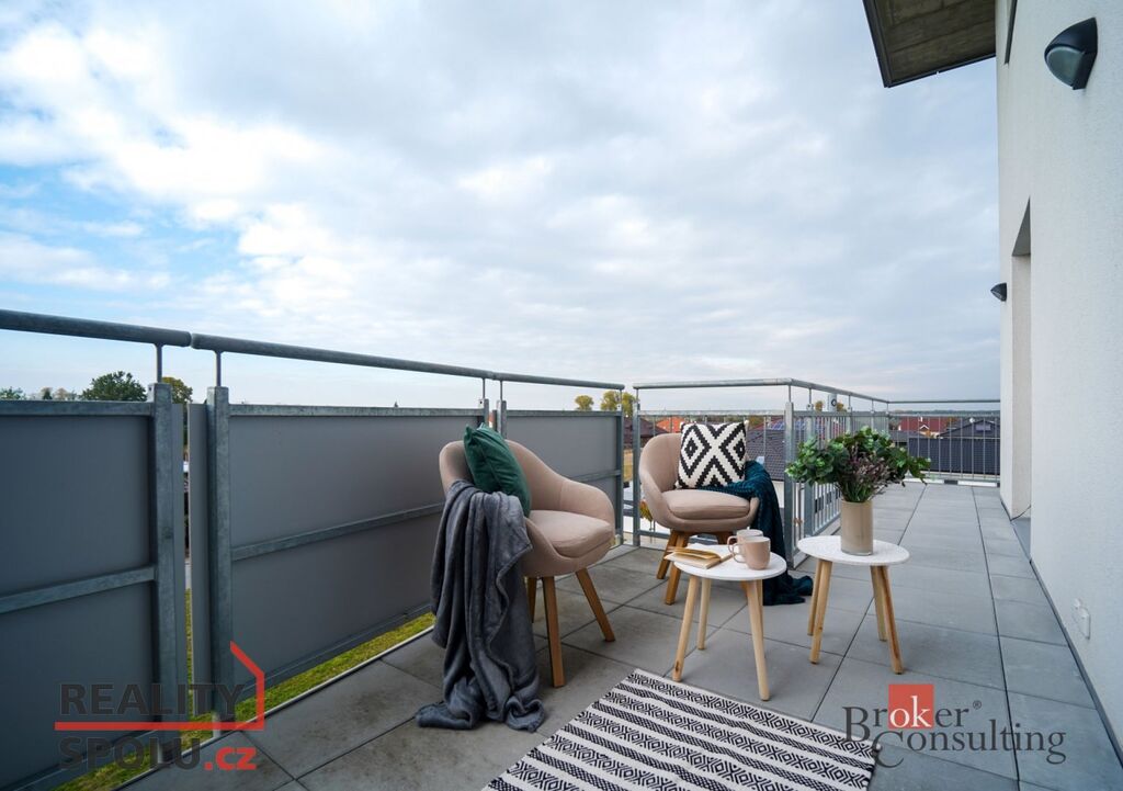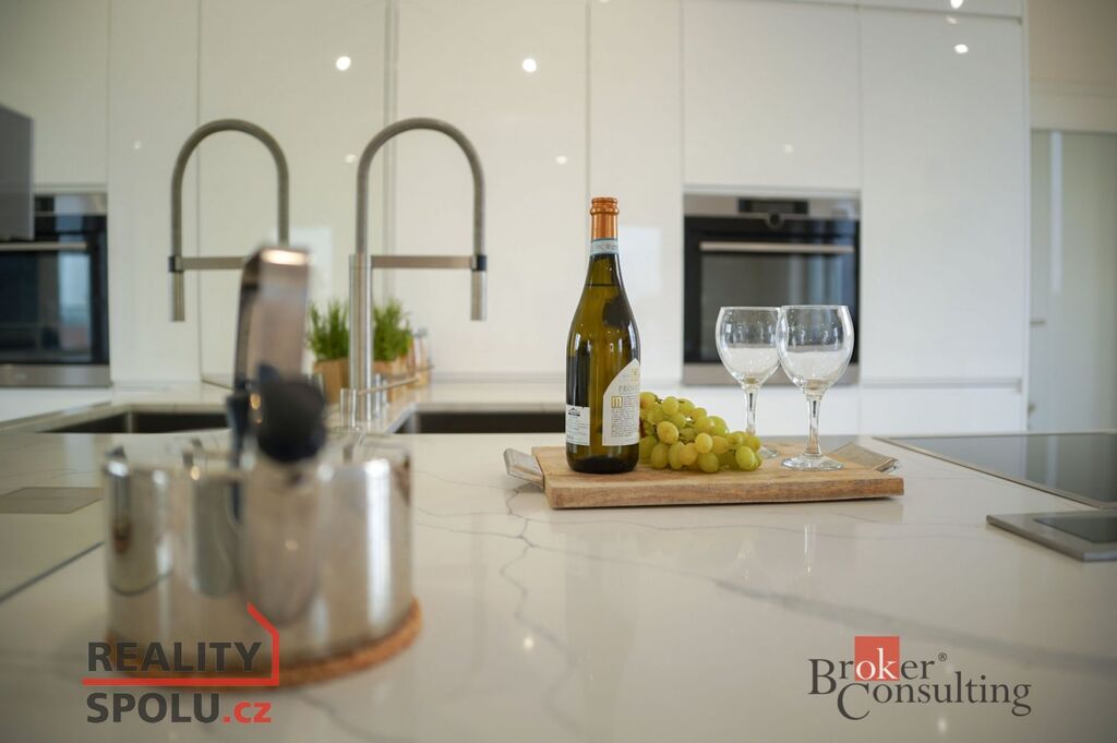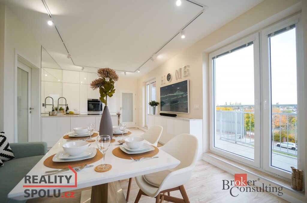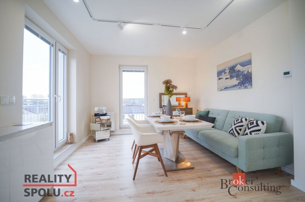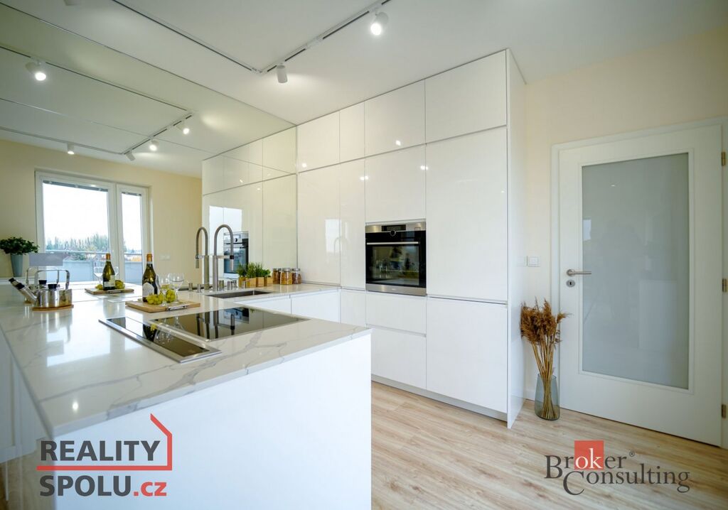 Do bytu vcházíte chodbou se zabudovanými šatními skříněmi a vstupem do šatny. Dále se dostáváme do prostorné a plně vybavené kuchyně s jídelním koutem. Kuchyň má moderní kuchyňskou linku s oboustranně lakovanými skříněmi, včetně zabudovaných značkových spotřebičů nevyšší řady AEG. Na kuchyň navazuje obývací pokoj. Z kuchyně, obývacího pokoje i ložnice je výstup na terasu. Z chodby je přístupná ložnice s lakovanými šatními skříněmi a moderním vnitřním vybavením, koupelna se sprchovým koutem a samostatné WC. Byt se nabízí včetně pračky AEG, sušičky AEG a TV s 5G internetem TV O2 a veškerým vybavením.