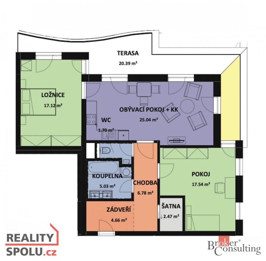 Výměra bytu orientovaného na severozápad je 85,3 m² a nachází se na 3. podlaží budovy, která byla postavena v rámci projektu Nový Žižkov. Součástí bytu je velkorysá terasa o velikosti 20,3 m².