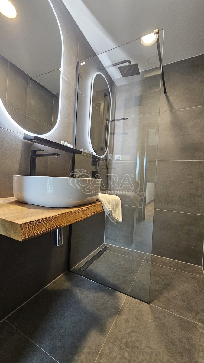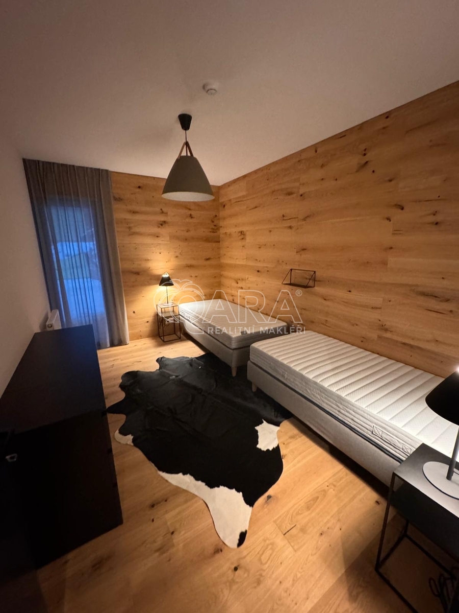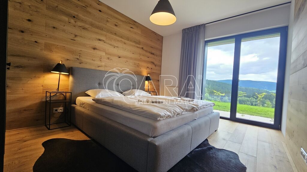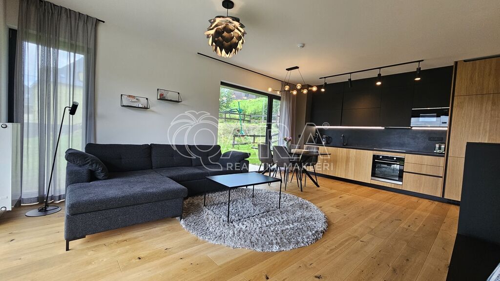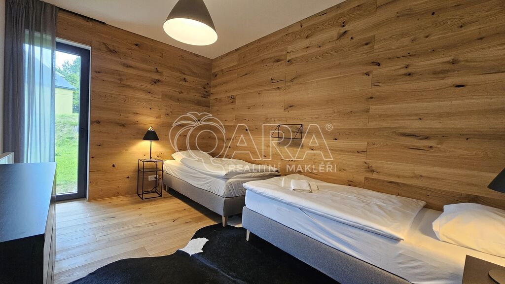 Překvapí vás moderním vybavením i příjemně sladěnými interiéry. Je navržen tak, aby co nejlépe vyhovoval potřebám rodin. V prostorném obývacím pokoji můžete snadno vytvořit hernu, kde si vaše děti mohou hrát a rozvíjet své tvořivé schopnosti. Je zde také dostatek prostoru pro rodinné aktivity, společné hry a pro chvíle relaxace. Velká francouzská okna spojující apartmán s rozlehlou terasou vám zajistí jedinečné spojení s přírodou.