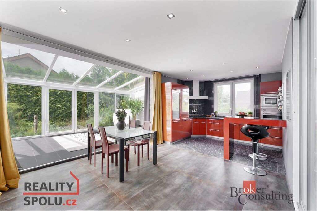 - Prostorný obývací pokoj spojený s kuchyní a zimní zahradou