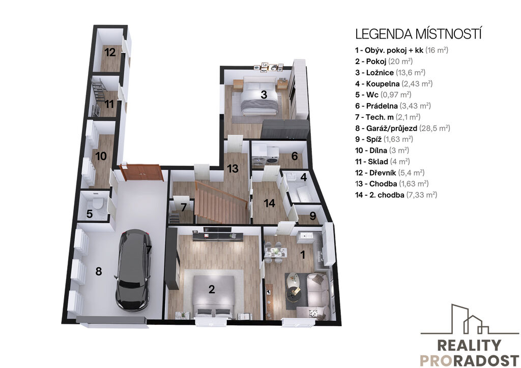 V přízemí se nachází 3 pokoje včetně kuchyňského kouta, koupelny, spíže, prádelny, WC, dílny a průjezdu. Dispozici 2.NP tvoří kuchyně s jídelnou, 3 pokoje, WC, koupelna, spíž a terasa. Půdní prostor pak nabízí teoretickou možnost o další rozšíření a třeba i rozdělení domu na nejméně 3 samostatné byty.