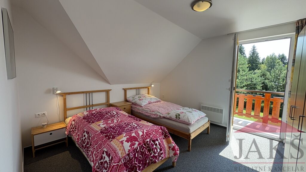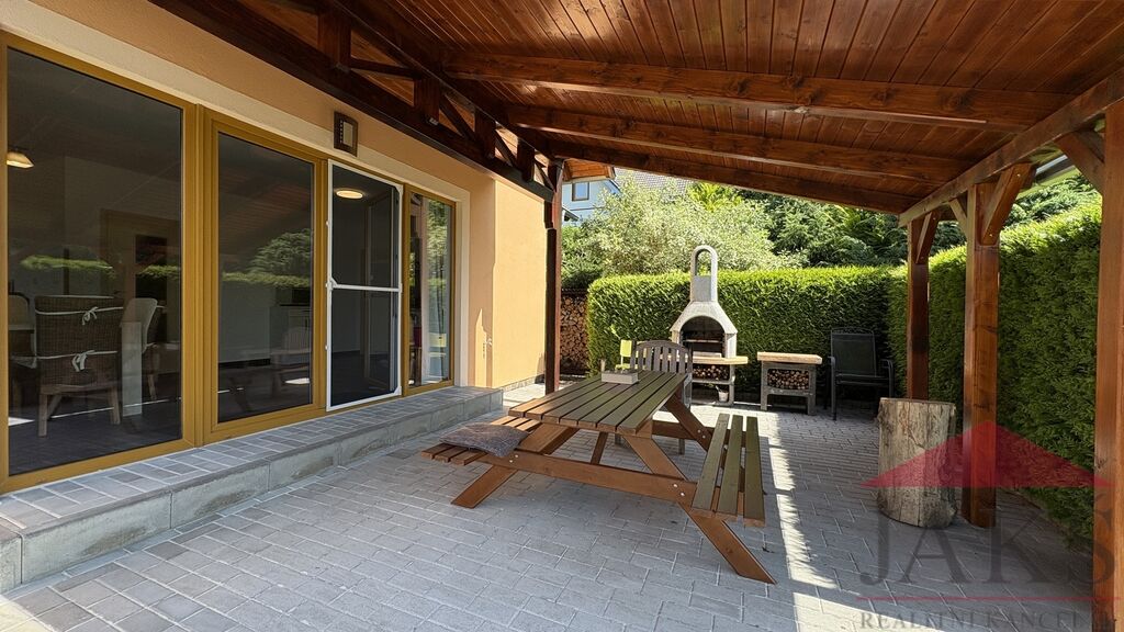 Popis: technická část: garáž (regály) a technická místnost (pračka); 1.NP (81,54 m2): předsíň (věšáky s botníkem), koupelna s finskou saunou (sprch. kout, umyv. se zrcadlem), sam. WC s umyv., ložnice, hala se schodištěm, komora (2x el. boiler), prostorný obývací pokoj 49 m2 s kuchyňským koutem (rohová kuch. linka s vestav. spotřebiči: HV a MV trouba, sklo-ker. deska, lednice, digestoř a myčka), jídelnou, krbovými kamny a vstupem na zastřešenou terasu s posezením a venkovním krbem; 2.NP (80,12 m2): podesta, koupelna (vana, sprch. kout, umyv. se zrcadlem, WC, topný žebřík), ložnice, 2x ložnice s balkonem s dechberoucím výhledem, uzamykatelná hlavní ložnice s vlastní koupelnou (vana, sprch. kout, umyv. se zrcadlem, WC, topný žebřík) s balkonem, šatnou a předsíní (vest. skříň). Movité vybavení vč. nábytku je v ceně.