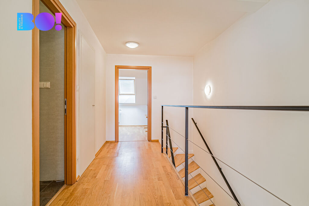 V podzemním podlaží najdete dvougaráž, komoru a velkou chodbu s úložným prostorem s východem do zahrady. V prvním patře pak zádveří, WC a veliký obývací prostor s kuchyní a východem na terasu a do zahrady. Ve druhém patře se nachází dva velké světlé pokoje spojené chodbou, koupelnou s vanou a WC, samostatným WC a komorou. Ve třetím (podkrovním) patře najdete opět dva veliké, světlé pokoje spojené chodbou a koupelnou s toaletou a sprchovým koutem.