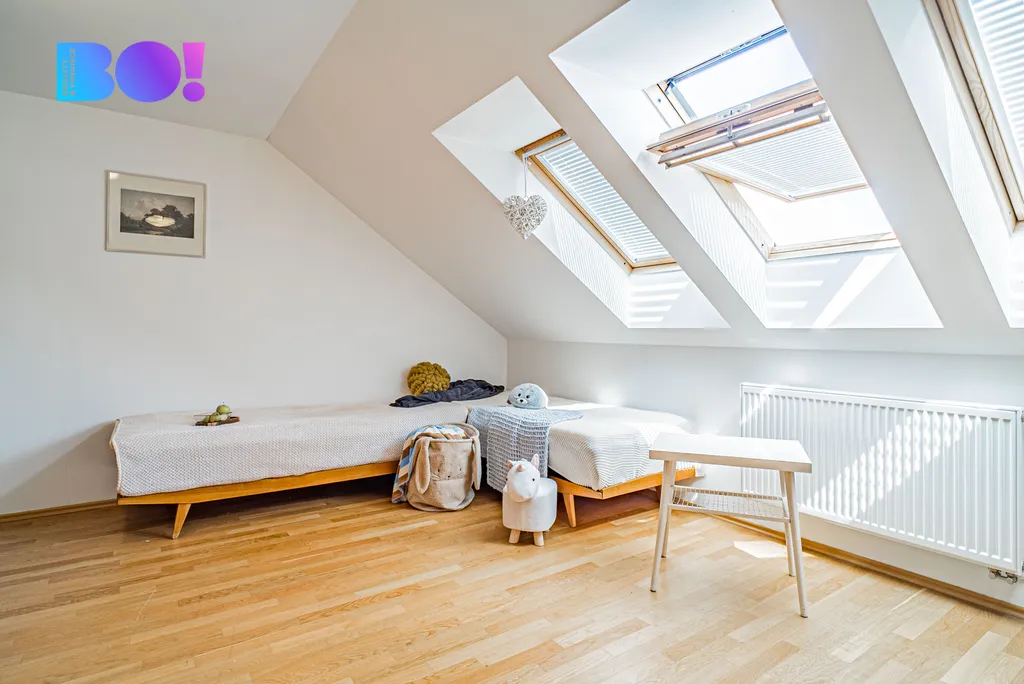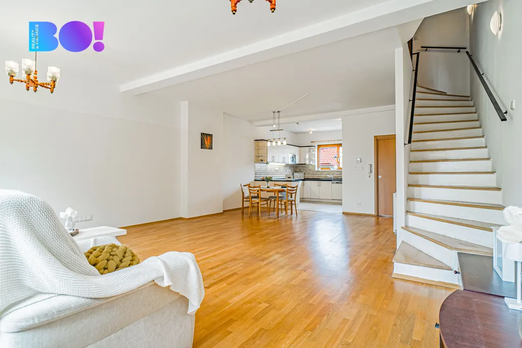Kuchyň propojená s obývacím pokojem nabízí 55 m² nadčasového prostoru s velkým množstvím denního světla – vysoké stropy a velká okna vytváří vzdušný dojem, který nebývá v řadových domech obvyklý. V celém domě naleznete kvalitní dřevěné masivní podlahy, dveře a zárubně i dřevěná střešní okna Velux a nadčasový design. V domě jsou dvě koupelny a každé patro má min. 1 WC, což je komfortní i pro větší rodinu nebo zástupce více generací. Všechna okna jsou opatřena žaluziemi.
