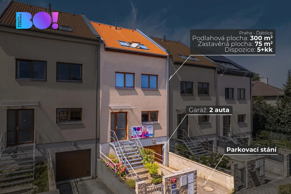 Exkluzivně nabízíme udržovaný řadový rodinný dům 5+kk ve Starých Ďáblicích (Praha 8) s užitnou plochou 300 m², ideální pro větší rodinu i vícegenerační bydlení nebo investici. Dům má tři nadzemní a jedno podzemní podlaží, prostornou terasu a krásnou zahradu se vzrostlými stromy včetně ovocných (meruňka, třešeň, švestka), která poskytuje dostatek soukromí i prostoru pro dětské hry, relaxaci nebo zahradničení.