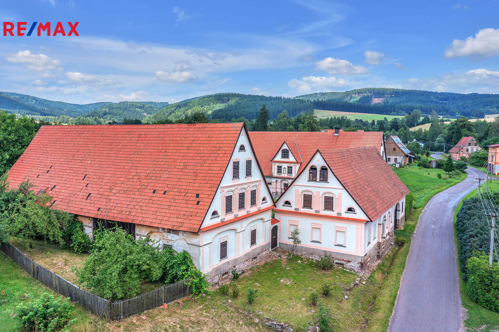 Ve výhradním zastoupení společností RE/MAX Future, Vám tímto nabízíme ke koupi honosný statek, skládající se ze 3 samostatných budov s pozemkem 3 078 m², v obci Heřmánkovice.