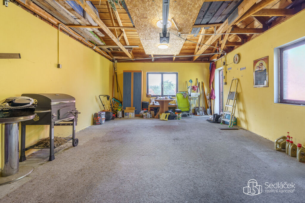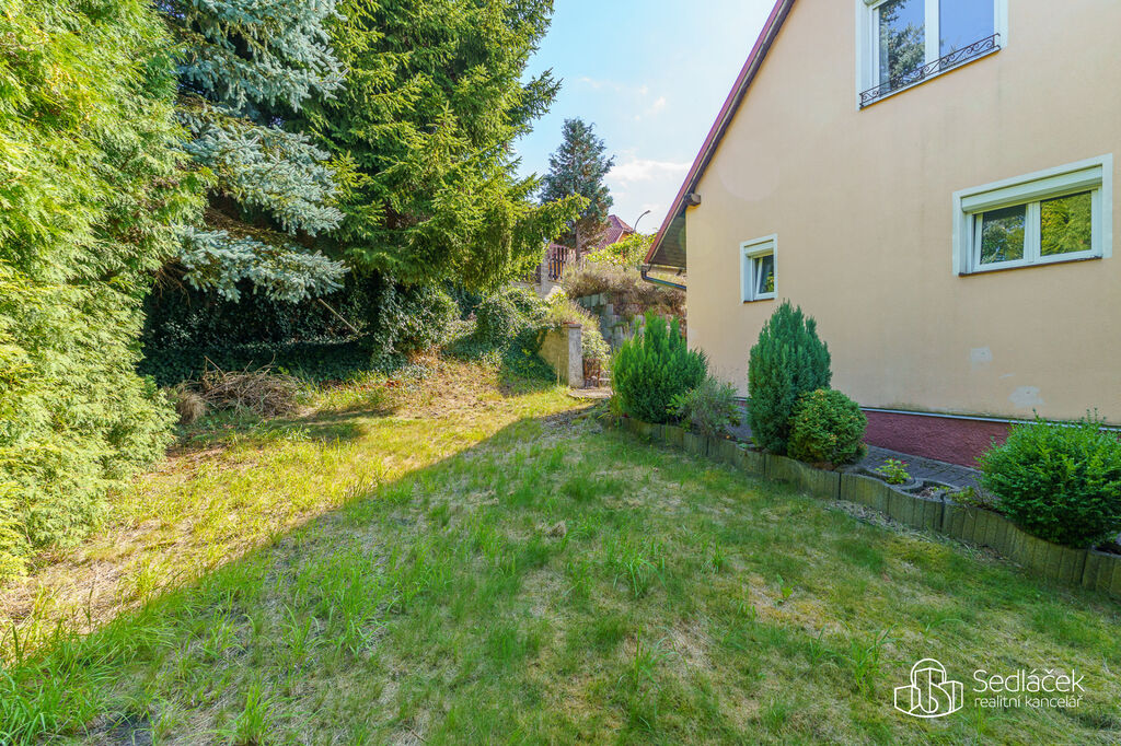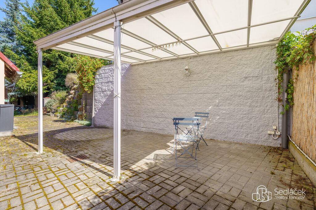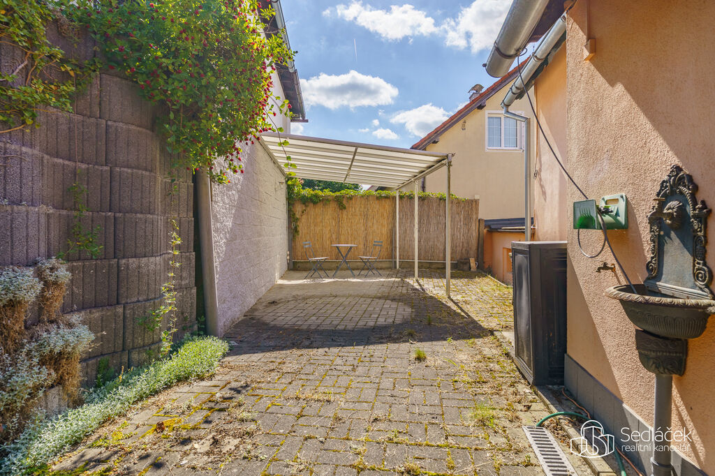 Exteriér nabízí zahradu se vzrostlými stromy, které je vhodné upravit, nicméně poskytují dostatek soukromí. Součástí je také venkovní kryté posezení a vydlážděný dvůr se zámkovou dlažbou, kterou lze snadno oživit vyčištěním.