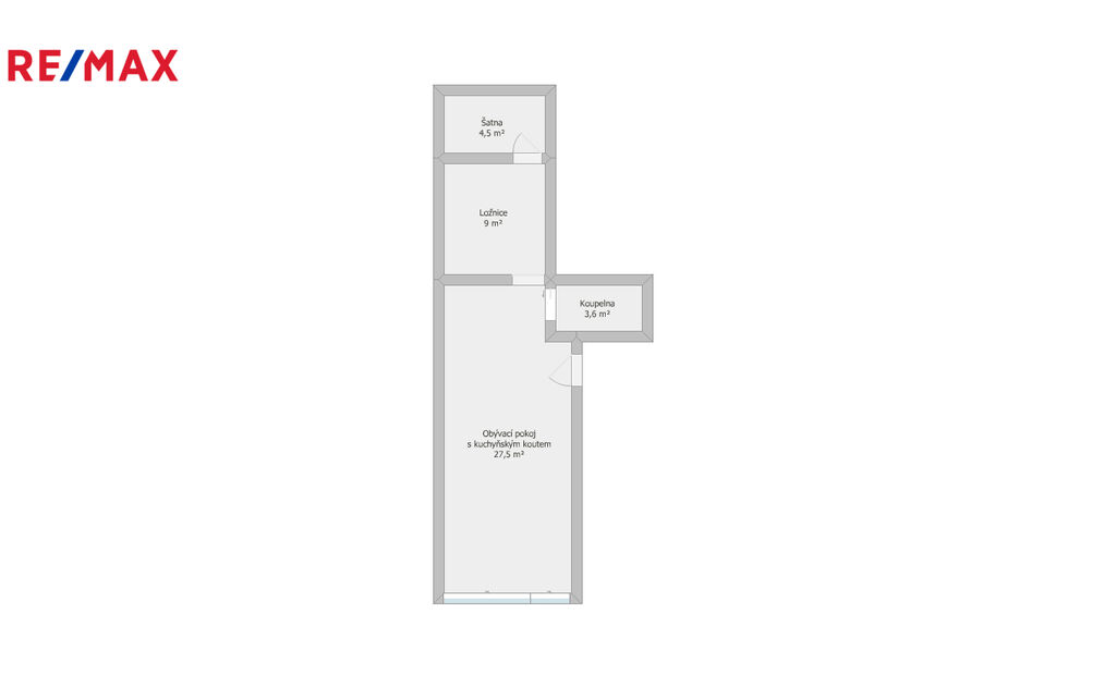Ze společné chodby vstoupíte do hlavní obytné místnosti – prostorného obývacího pokoje s kuchyňským koutem (27,5 m²). Na něj navazuje ložnice (9 m²) se samostatnou šatnou s úložným systémem (4,5 m²) a moderní koupelna se sprchovým koutem a WC (3,6 m²).