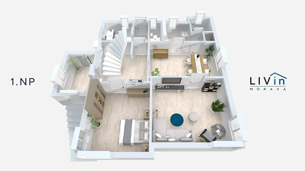 V 1. NP domu se nachází vstupní vestibul, předsíň, ložnice, další obytný pokoj, prostorná jídelna, kuchyň, komora, samostatné WC, koupelna a technická místnost (prádelna).