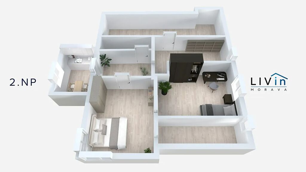 Po dřevěném schodišti se dostanete do 2. NP, kde se nachází předsíň a tři místnosti. V jedné z nich byla původně kuchyň. Další 2 pokoje jsou nyní průchozí, do budoucna však lze do obou pokojů vytvořit samostatné vstupy z předsíně. Prostory lze navíc rozšířit o stávající půdní prostory a je možno dobudovat koupelnu s WC i kuchyňskou linku. Díky tomu může druhé podlaží sloužit jako plnohodnotná samostatná bytová jednotka.