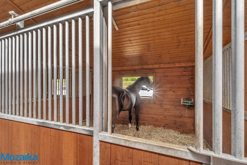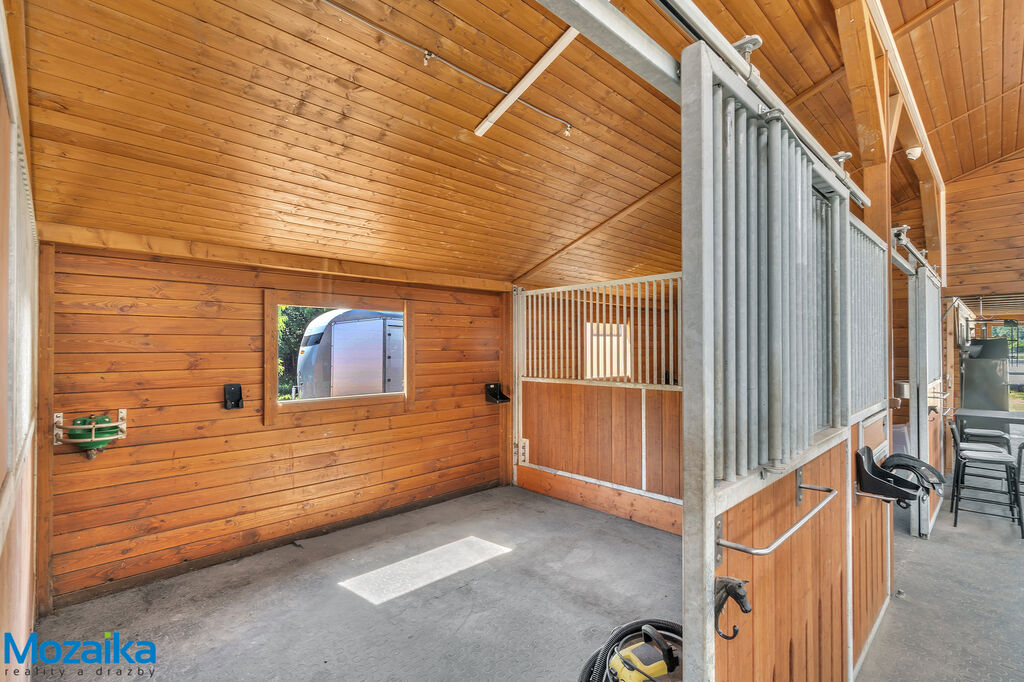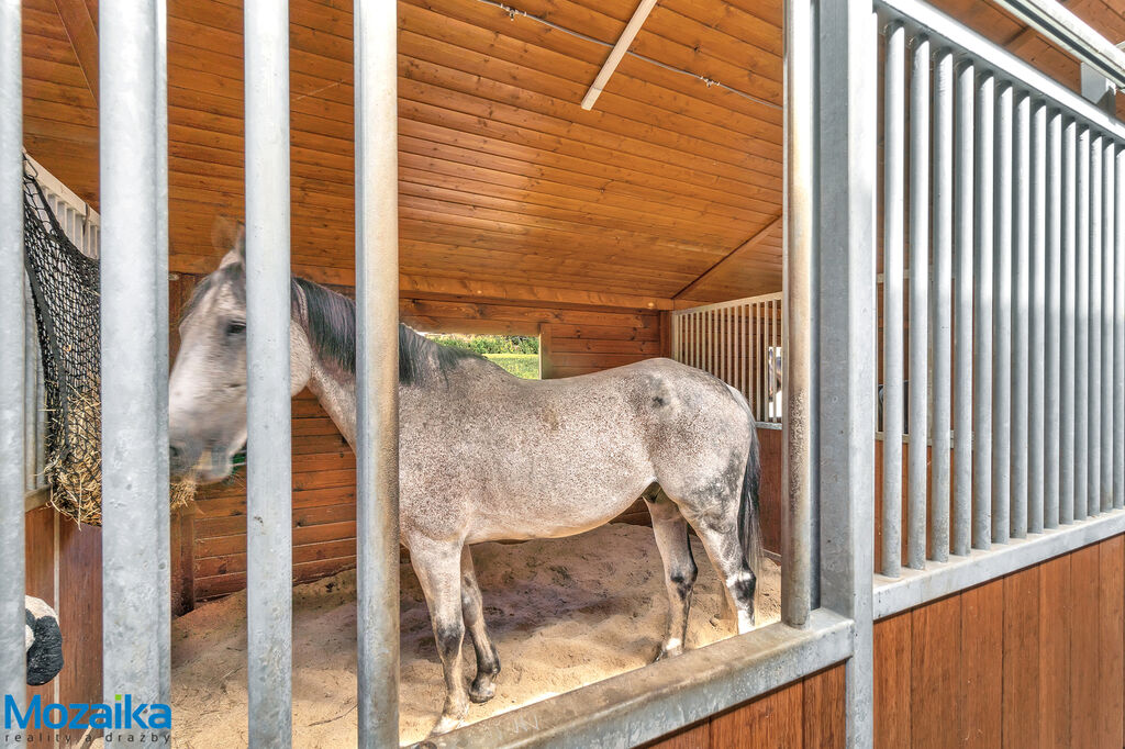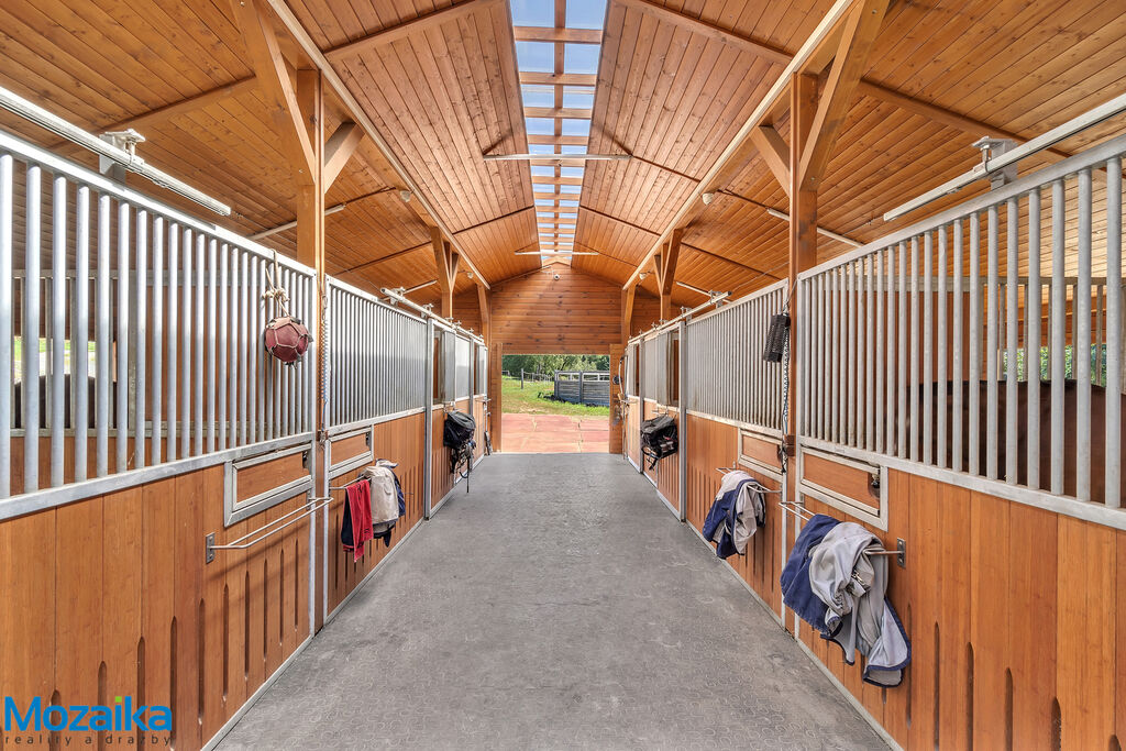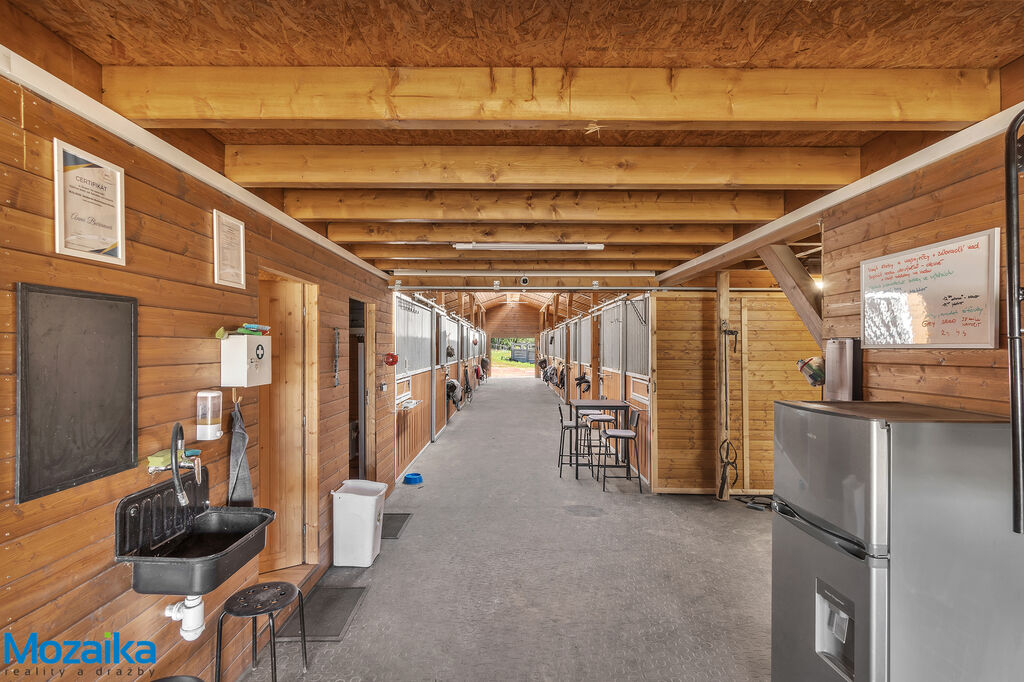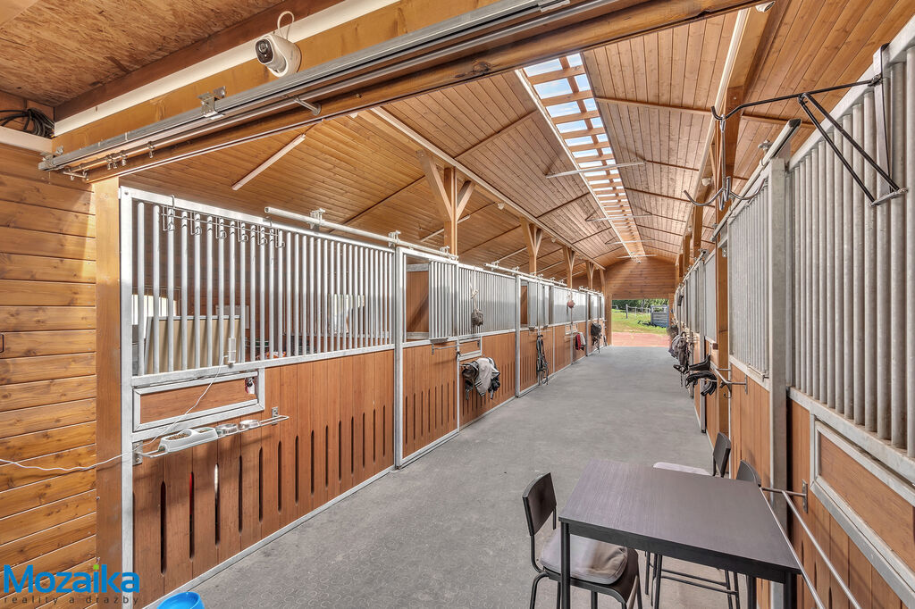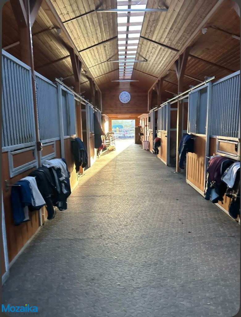 Jedná se o dřevostavbu, která nabízí deset boxů o rozměru 4 x 3,5m, mycí box, přípravný box se soláriem, dvě sedlovny s kuchyňkou, sprchu s WC a pokoj pro stájníka. Krajní boxy lze propojit a získat tak velké boxy např. pro klisnu s hříbětem. Dva boxy lze otevřít celou stěnu pro případ nutné manipulace např. s nepohyblivým koněm. Každý box má okno, otočný žlab a své světlo pro případ, že bude nutné svítit u některého koně v noci. Nerušíme tak ostatní koně. Ve stáji je instalována také vodní mlha pro velká vedra a kamerový systém vnitřní i venkovní. Dále měřák na sledování CO2, teploty a vlhkosti vzduchu. Stáj má velmi příznivé klima, je světlá a vzdušná a i ve velkých vedrech je zde příjemně. Na celé ploše podlah je speciální neklouzavá guma. Vedle stáje je jízdárna s hrazením o rozměru 27 x 45m s povrchem písek a geotextílie s instalovaným zavlažováním. Z druhé strany stáje je pak ohrazená kruhovka o průměru 16m taktéž s pískem a geotextilií. Dále navazují pastviny pro deset koní, rozdělené ohradníky. Pastviny lze přemisťovat při vypasení, protože ploha areálu činí 3ha. Součástí pronájmu je také kompletní vybavení stáje i strojů pro údržbu areálu a povrchů. K dispozici je také napařovák sena. Jedná se o dlouhodobý pronájem, ideální pro majitele více koní, který chce mít péči o své koně plně pod kontrolou a ještě ušetřit finance. Cena pronájmu činí 70.000,-Kč měsíčně včetně vybavení plus spotřebovaná elektřina a poplatky za odvoz kontejneru s hnojem a čištění jímky .
