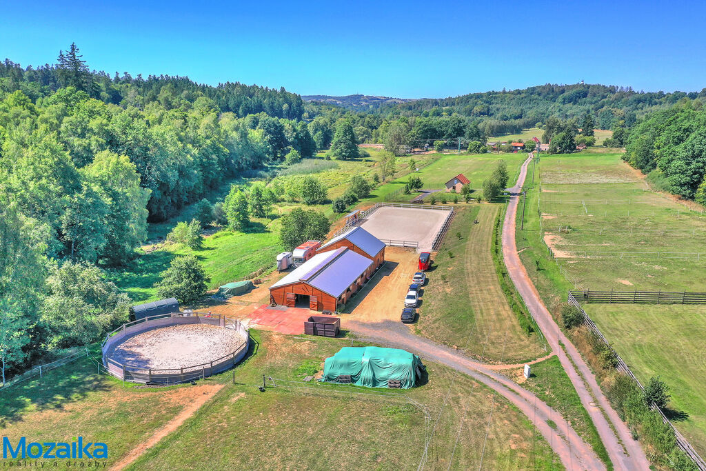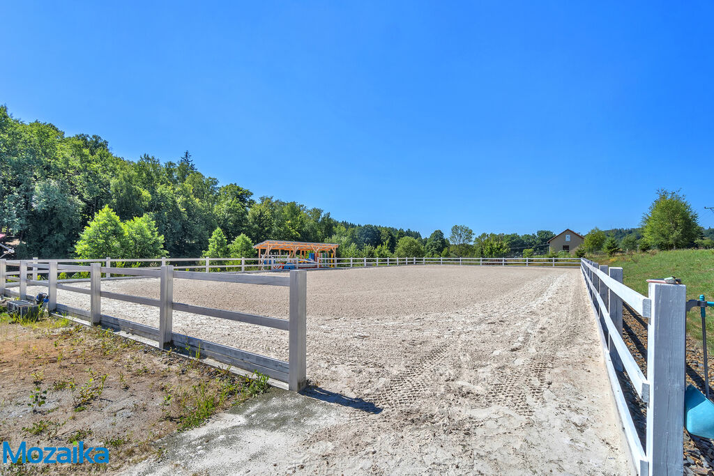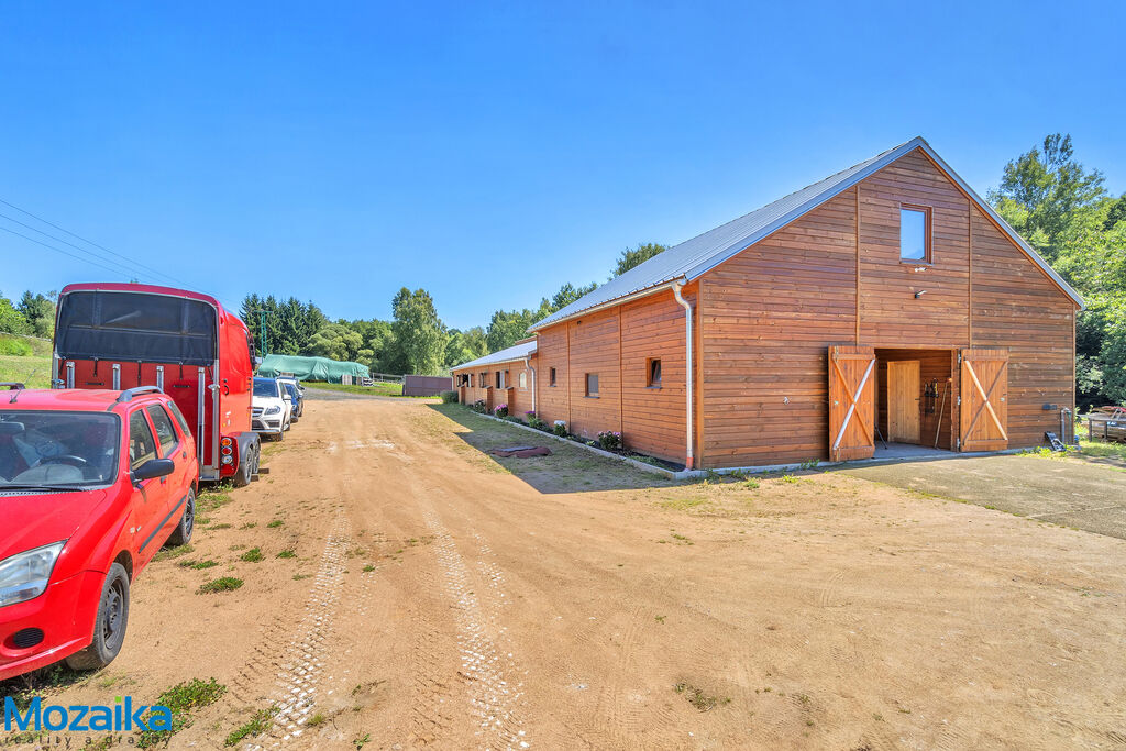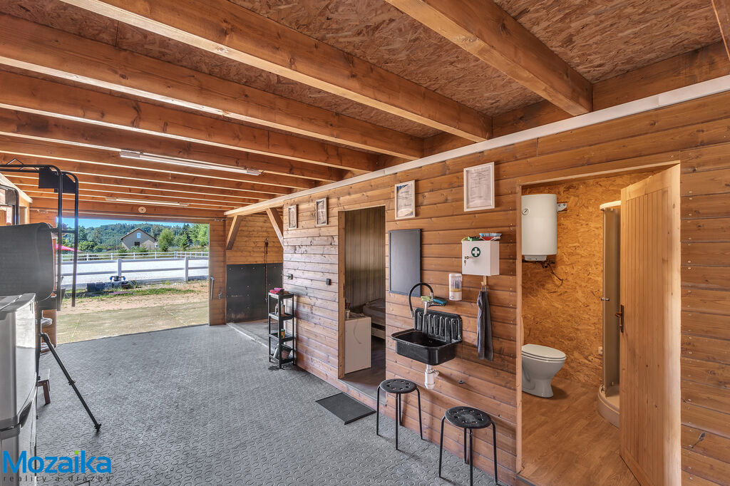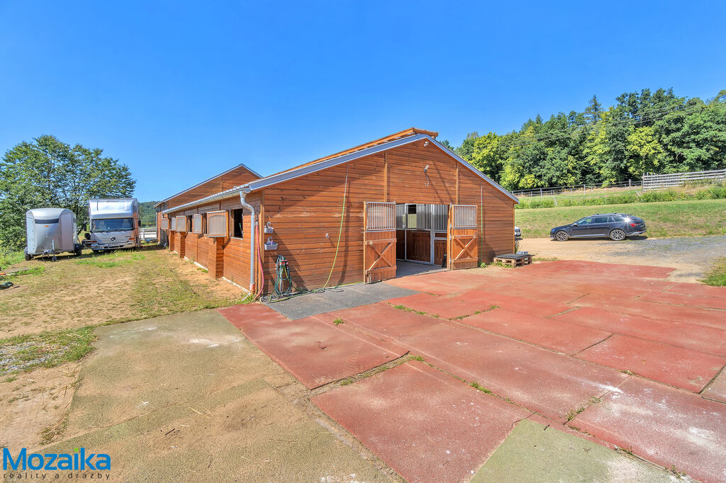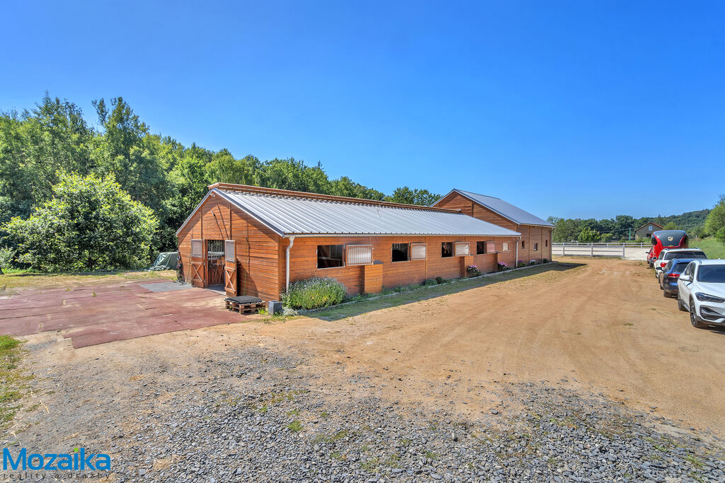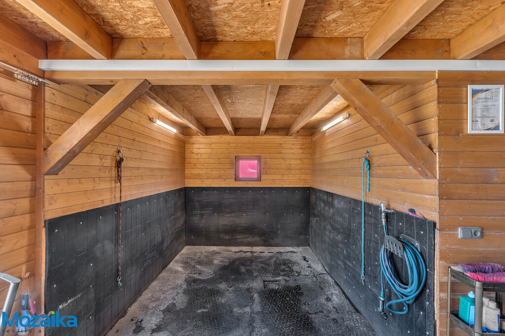 Jedná se o dřevostavbu, která nabízí deset boxů o rozměru 4 x 3,5m, mycí box, přípravný box se soláriem, dvě sedlovny s kuchyňkou, sprchu s WC a pokoj pro stájníka. Krajní boxy lze propojit a získat tak velké boxy např. pro klisnu s hříbětem. Dva boxy lze otevřít celou stěnu pro případ nutné manipulace např. s nepohyblivým koněm. Každý box má okno, otočný žlab a své světlo pro případ, že bude nutné svítit u některého koně v noci. Nerušíme tak ostatní koně. Ve stáji je instalována také vodní mlha pro velká vedra a kamerový systém vnitřní i venkovní. Dále měřák na sledování CO2, teploty a vlhkosti vzduchu. Stáj má velmi příznivé klima, je světlá a vzdušná a i ve velkých vedrech je zde příjemně. Na celé ploše podlah je speciální neklouzavá guma. Vedle stáje je jízdárna s hrazením o rozměru 27 x 45m s povrchem písek a geotextílie s instalovaným zavlažováním. Z druhé strany stáje je pak ohrazená kruhovka o průměru 16m taktéž s pískem a geotextilií. Dále navazují pastviny pro deset koní, rozdělené ohradníky. Pastviny lze přemisťovat při vypasení, protože ploha areálu činí 3ha. Součástí pronájmu je také kompletní vybavení stáje i strojů pro údržbu areálu a povrchů. K dispozici je také napařovák sena. Jedná se o dlouhodobý pronájem, ideální pro majitele více koní, který chce mít péči o své koně plně pod kontrolou a ještě ušetřit finance. Cena pronájmu činí 70.000,-Kč měsíčně včetně vybavení plus spotřebovaná elektřina a poplatky za odvoz kontejneru s hnojem a čištění jímky .