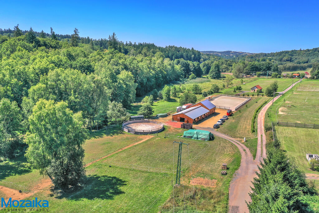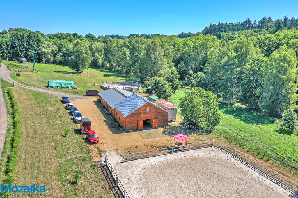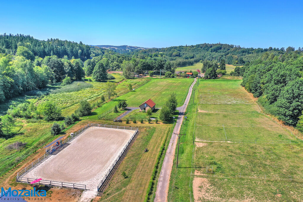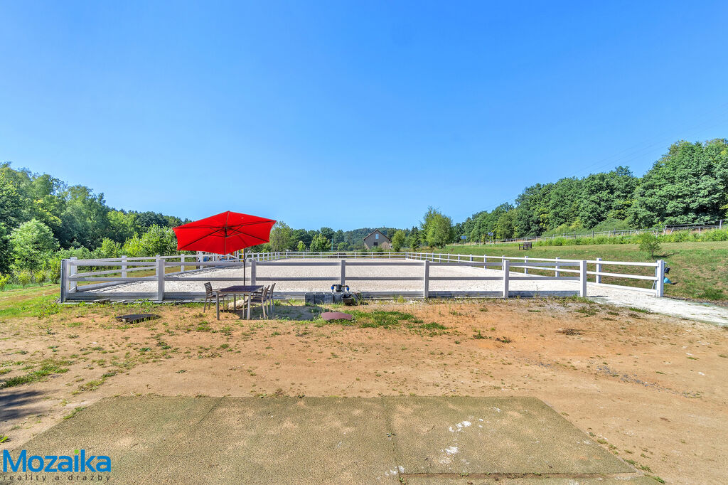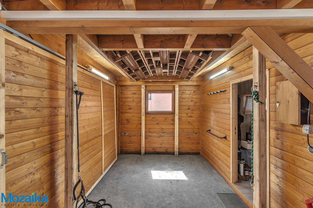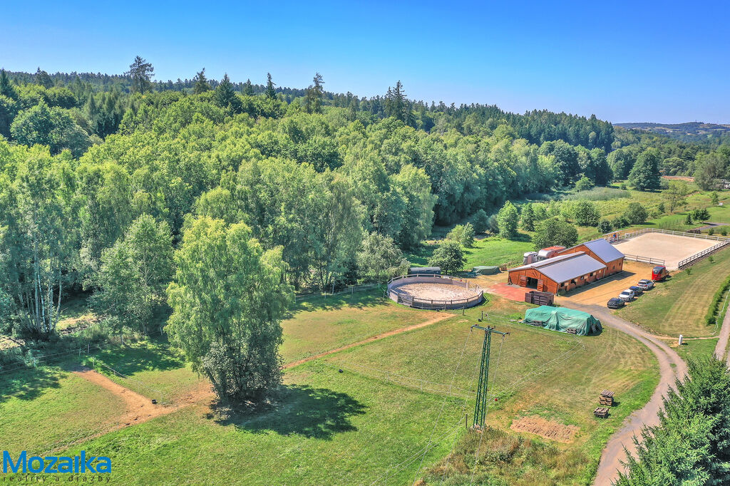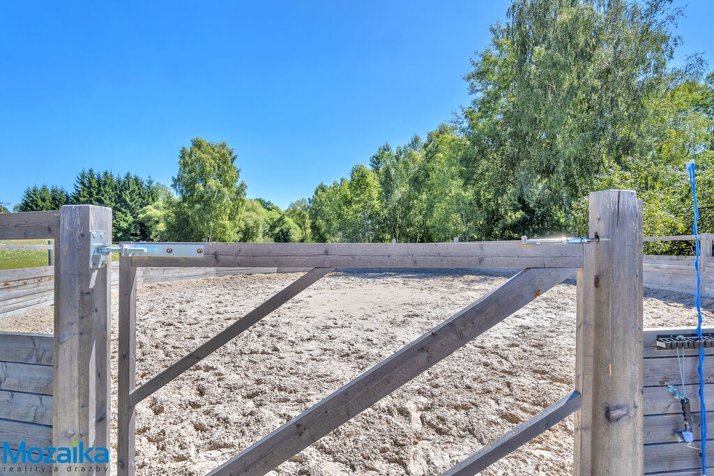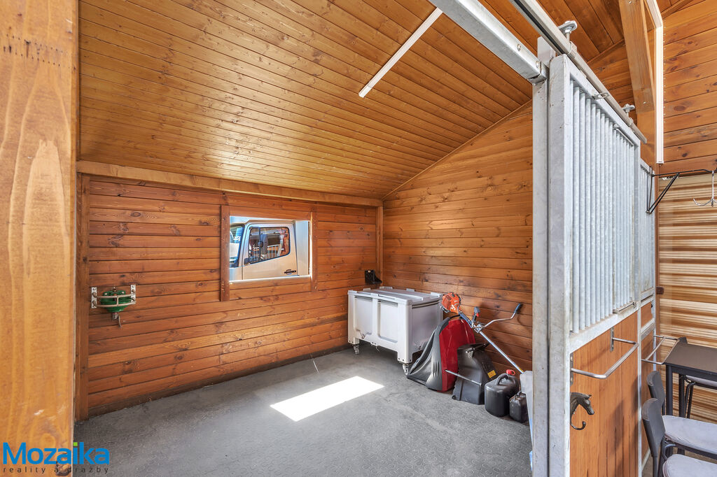 Jedná se o dřevostavbu, která nabízí deset boxů o rozměru 4 x 3,5m, mycí box, přípravný box se soláriem, dvě sedlovny s kuchyňkou, sprchu s WC a pokoj pro stájníka. Krajní boxy lze propojit a získat tak velké boxy např. pro klisnu s hříbětem. Dva boxy lze otevřít celou stěnu pro případ nutné manipulace např. s nepohyblivým koněm. Každý box má okno, otočný žlab a své světlo pro případ, že bude nutné svítit u některého koně v noci. Nerušíme tak ostatní koně. Ve stáji je instalována také vodní mlha pro velká vedra a kamerový systém vnitřní i venkovní. Dále měřák na sledování CO2, teploty a vlhkosti vzduchu. Stáj má velmi příznivé klima, je světlá a vzdušná a i ve velkých vedrech je zde příjemně. Na celé ploše podlah je speciální neklouzavá guma. Vedle stáje je jízdárna s hrazením o rozměru 27 x 45m s povrchem písek a geotextílie s instalovaným zavlažováním. Z druhé strany stáje je pak ohrazená kruhovka o průměru 16m taktéž s pískem a geotextilií. Dále navazují pastviny pro deset koní, rozdělené ohradníky. Pastviny lze přemisťovat při vypasení, protože ploha areálu činí 3ha. Součástí pronájmu je také kompletní vybavení stáje i strojů pro údržbu areálu a povrchů. K dispozici je také napařovák sena. Jedná se o dlouhodobý pronájem, ideální pro majitele více koní, který chce mít péči o své koně plně pod kontrolou a ještě ušetřit finance. Cena pronájmu činí 70.000,-Kč měsíčně včetně vybavení plus spotřebovaná elektřina a poplatky za odvoz kontejneru s hnojem a čištění jímky .