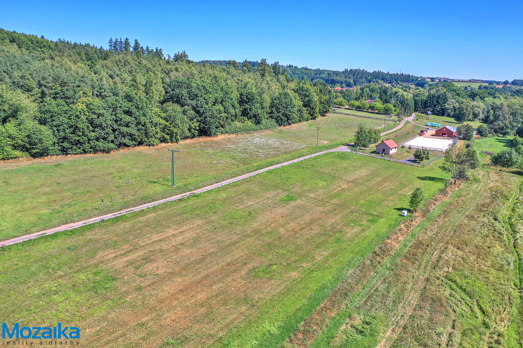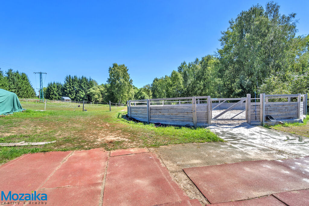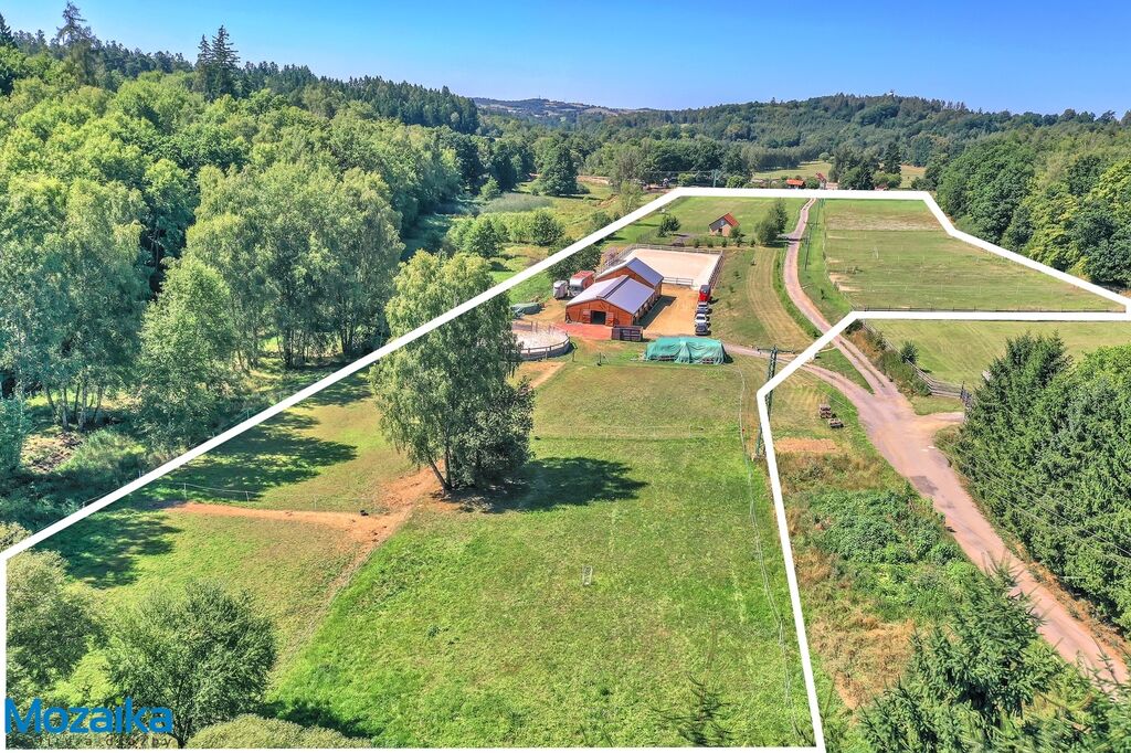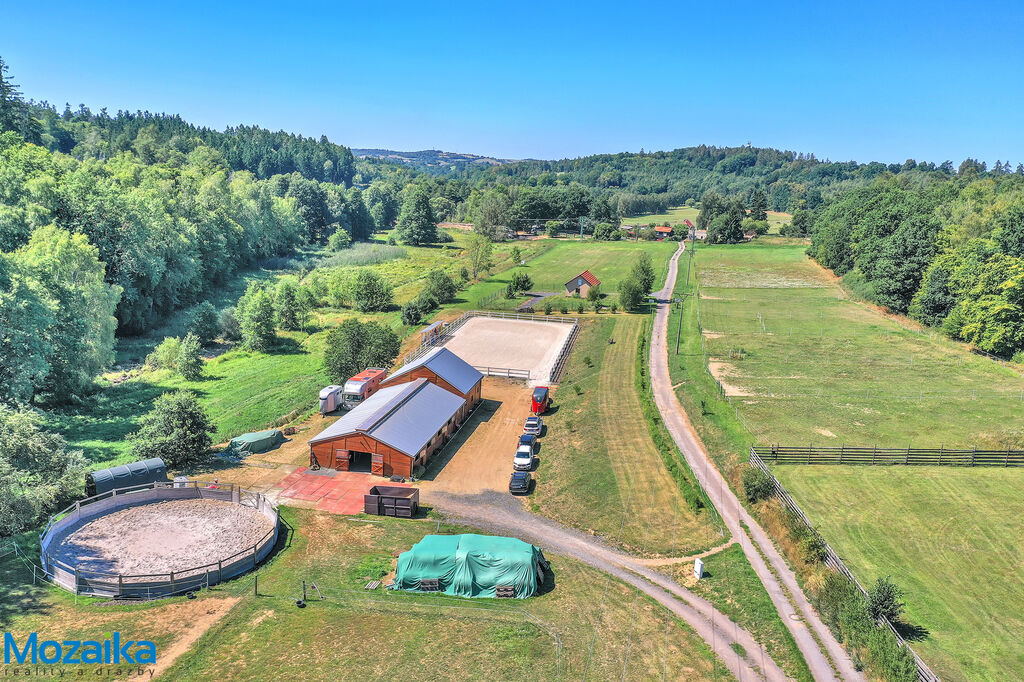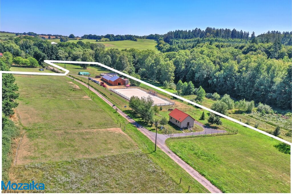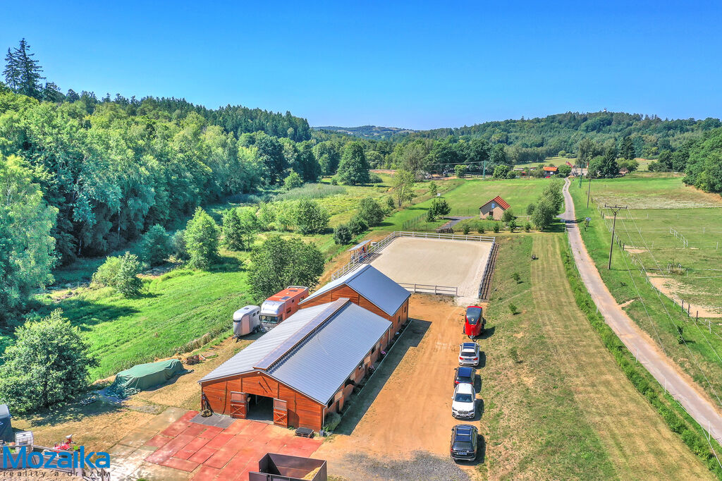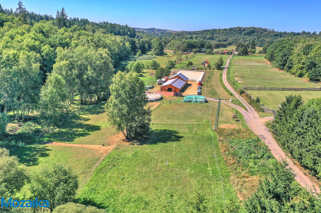 Jedná se o dřevostavbu, která nabízí deset boxů o rozměru 4 x 3,5m, mycí box, přípravný box se soláriem, dvě sedlovny s kuchyňkou, sprchu s WC a pokoj pro stájníka. Krajní boxy lze propojit a získat tak velké boxy např. pro klisnu s hříbětem. Dva boxy lze otevřít celou stěnu pro případ nutné manipulace např. s nepohyblivým koněm. Každý box má okno, otočný žlab a své světlo pro případ, že bude nutné svítit u některého koně v noci. Nerušíme tak ostatní koně. Ve stáji je instalována také vodní mlha pro velká vedra a kamerový systém vnitřní i venkovní. Dále měřák na sledování CO2, teploty a vlhkosti vzduchu. Stáj má velmi příznivé klima, je světlá a vzdušná a i ve velkých vedrech je zde příjemně. Na celé ploše podlah je speciální neklouzavá guma. Vedle stáje je jízdárna s hrazením o rozměru 27 x 45m s povrchem písek a geotextílie s instalovaným zavlažováním. Z druhé strany stáje je pak ohrazená kruhovka o průměru 16m taktéž s pískem a geotextilií. Dále navazují pastviny pro deset koní, rozdělené ohradníky. Pastviny lze přemisťovat při vypasení, protože ploha areálu činí 3ha. Součástí pronájmu je také kompletní vybavení stáje i strojů pro údržbu areálu a povrchů. K dispozici je také napařovák sena. Jedná se o dlouhodobý pronájem, ideální pro majitele více koní, který chce mít péči o své koně plně pod kontrolou a ještě ušetřit finance. Cena pronájmu činí 70.000,-Kč měsíčně včetně vybavení plus spotřebovaná elektřina a poplatky za odvoz kontejneru s hnojem a čištění jímky .