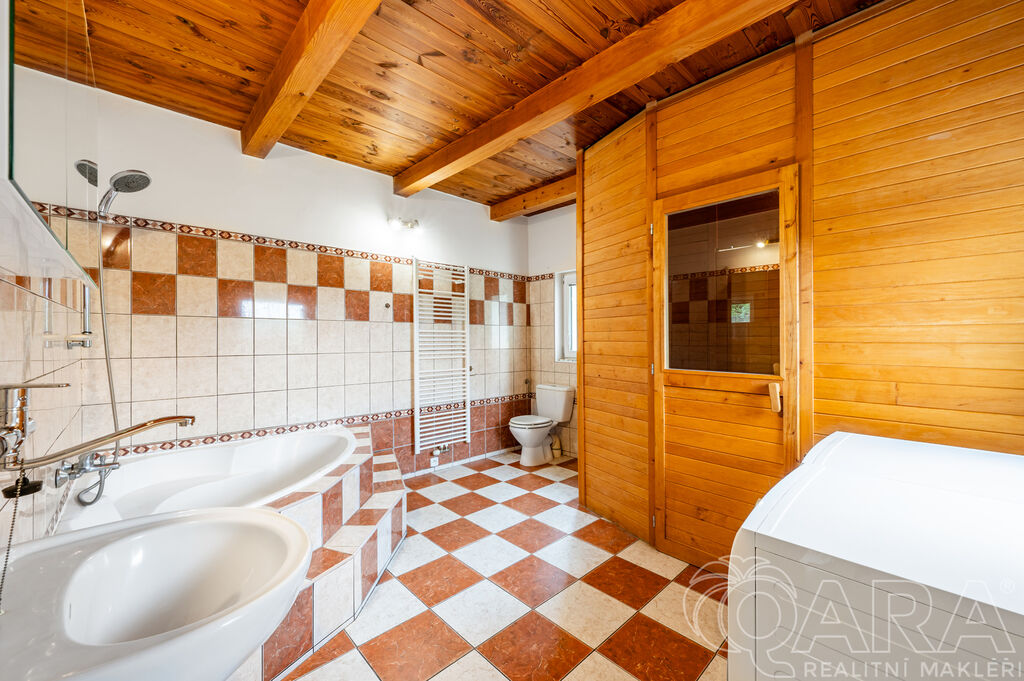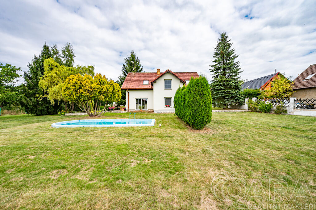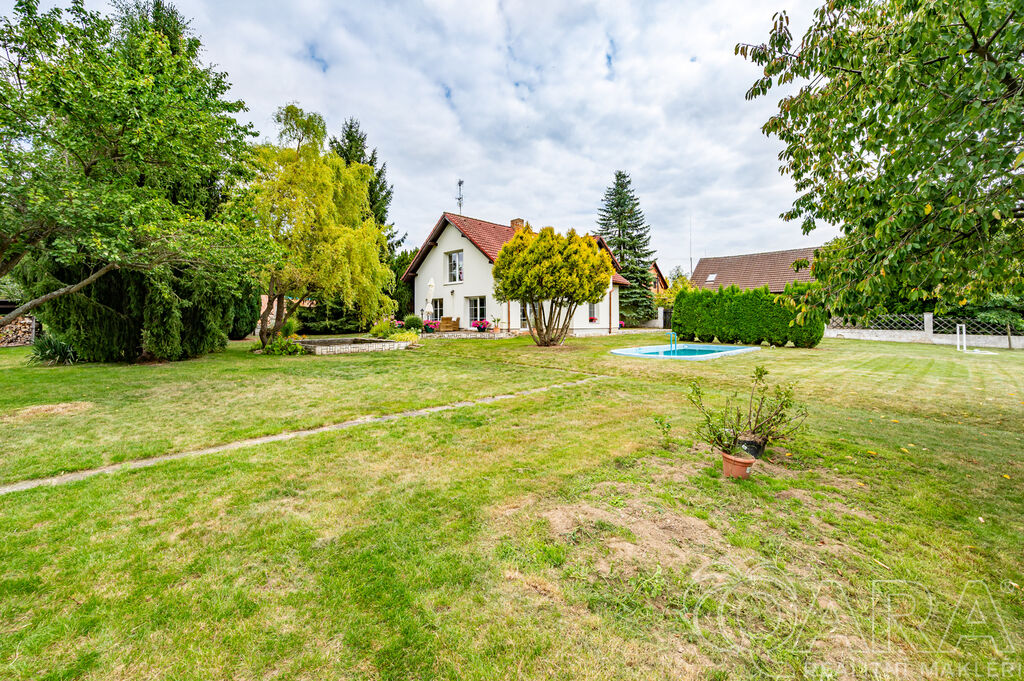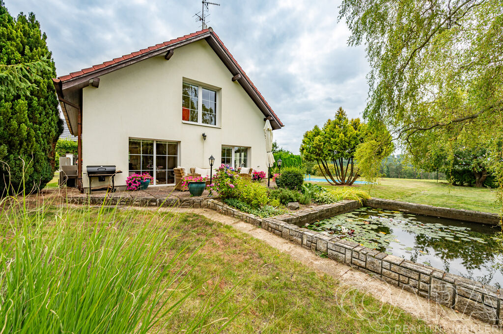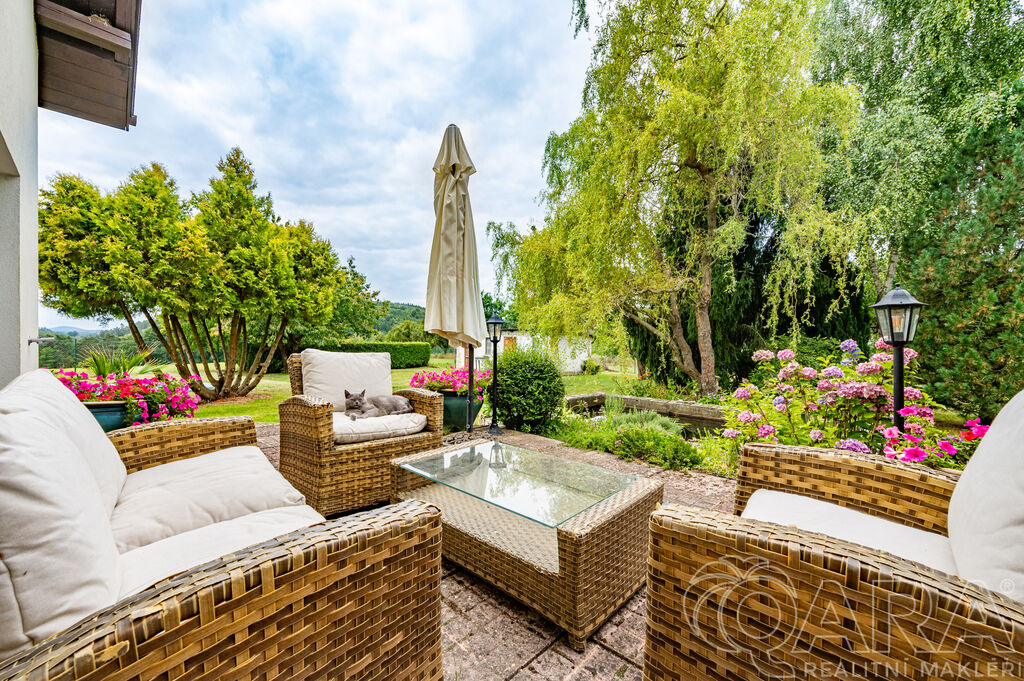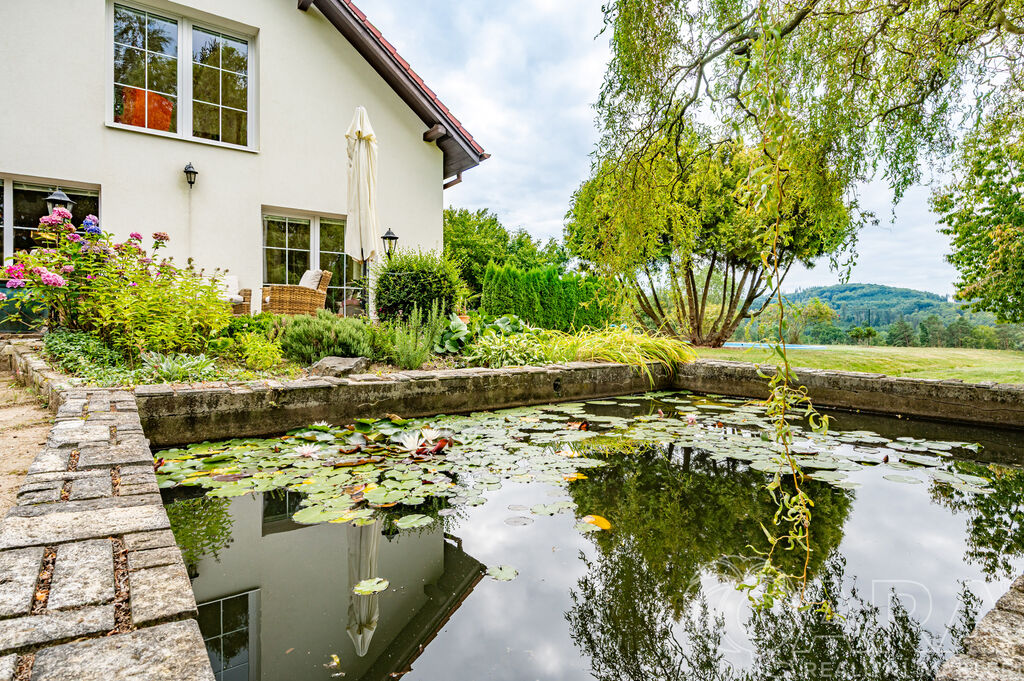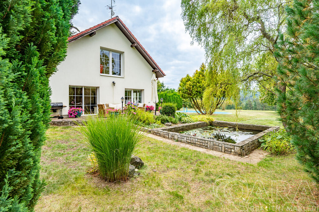 Vzrostlá zahrada poskytuje soukromí, krásné výhledy a dostatek prostoru pro odpočinek i volnočasové aktivity. Na terasu navazuje jezírko napájené dešťovou vodou, bazén s hloubkou 1,9 m a vlastní pískovou filtrací a zahradní domek, který slouží k uložení zahradního náčiní. Na pozemku najdete i zákoutí pro grilování, sport či zahradničení včetně vzrostlých ovocných stromů.