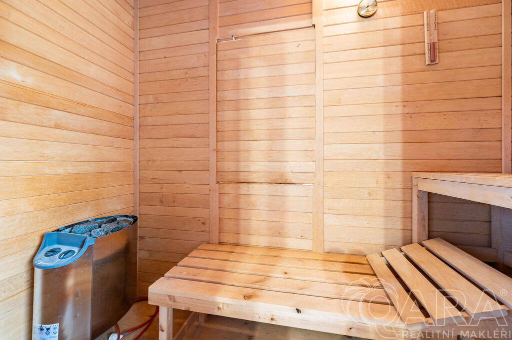 V přízemí najdete prostorný obývací pokoj se západní orientací, krbovými kamny a přímým vstupem do zahrady, velkorysou plně vybavenou kuchyni v přírodním designu a koupelnu s vanou, saunou a toaletou. Samozřejmostí je i technické zázemí.