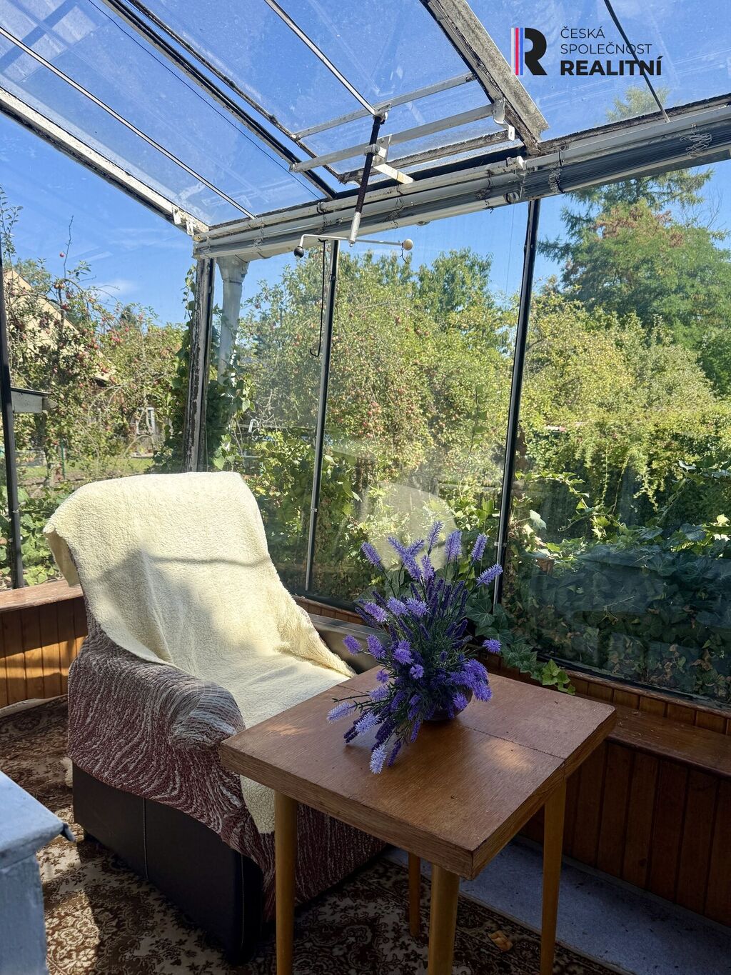 Menší zahrada s ovocnými stromy - jabloně, živý plot po obvodu sousedícího pozemku a s původním altánkem.