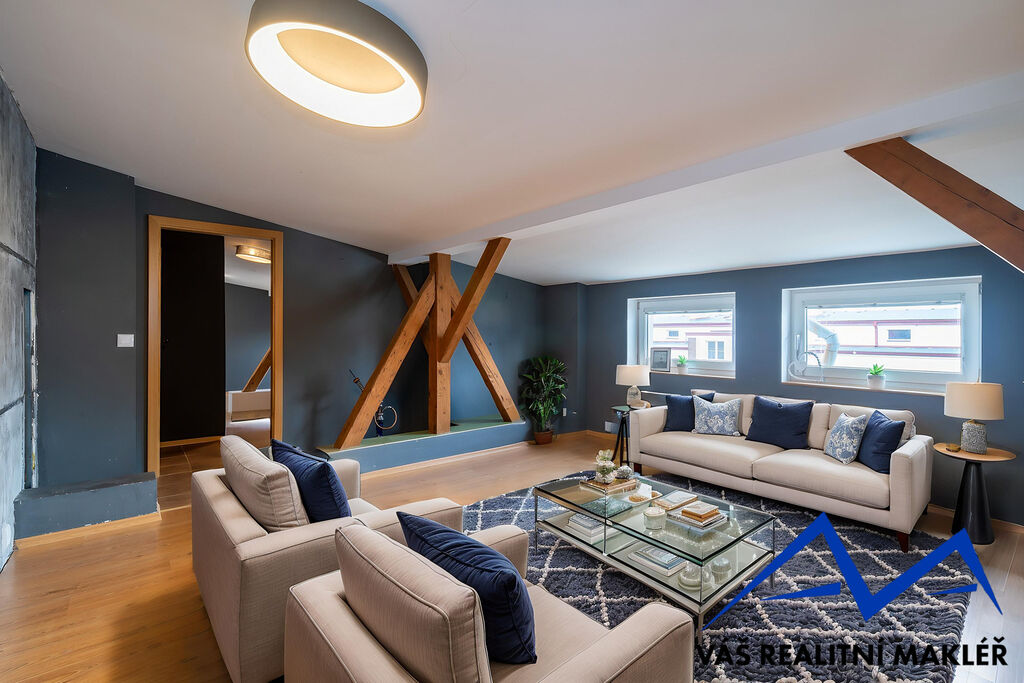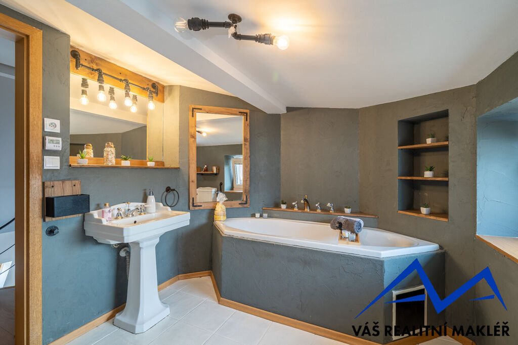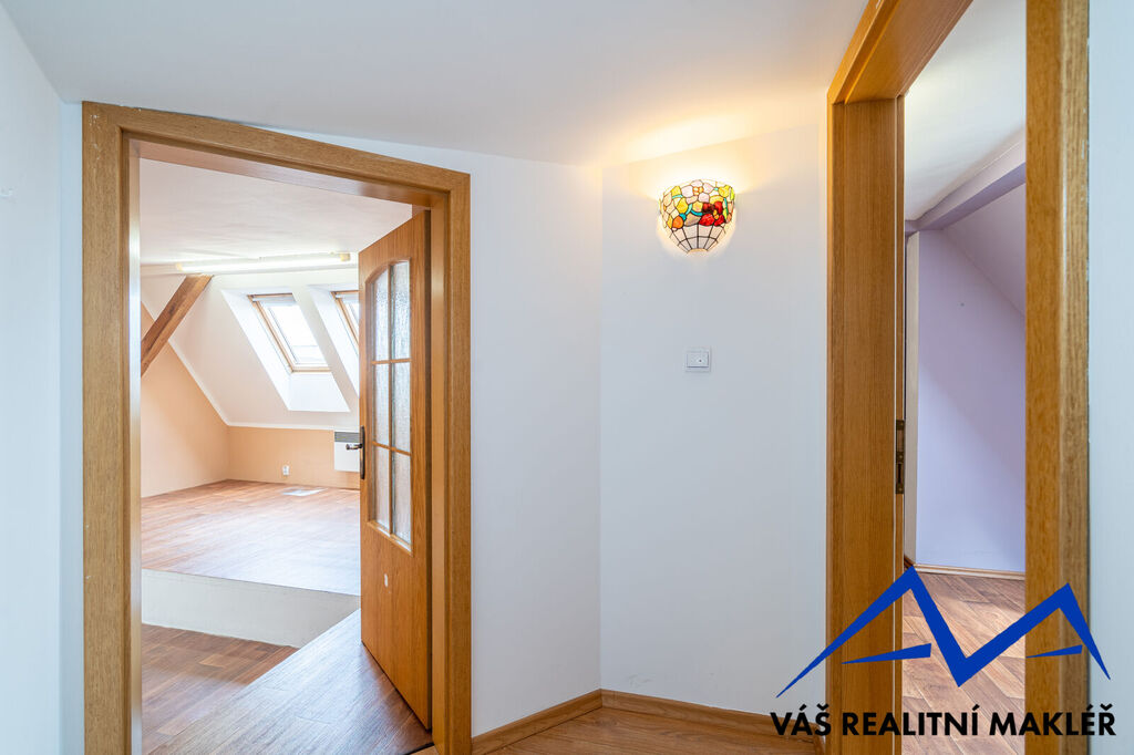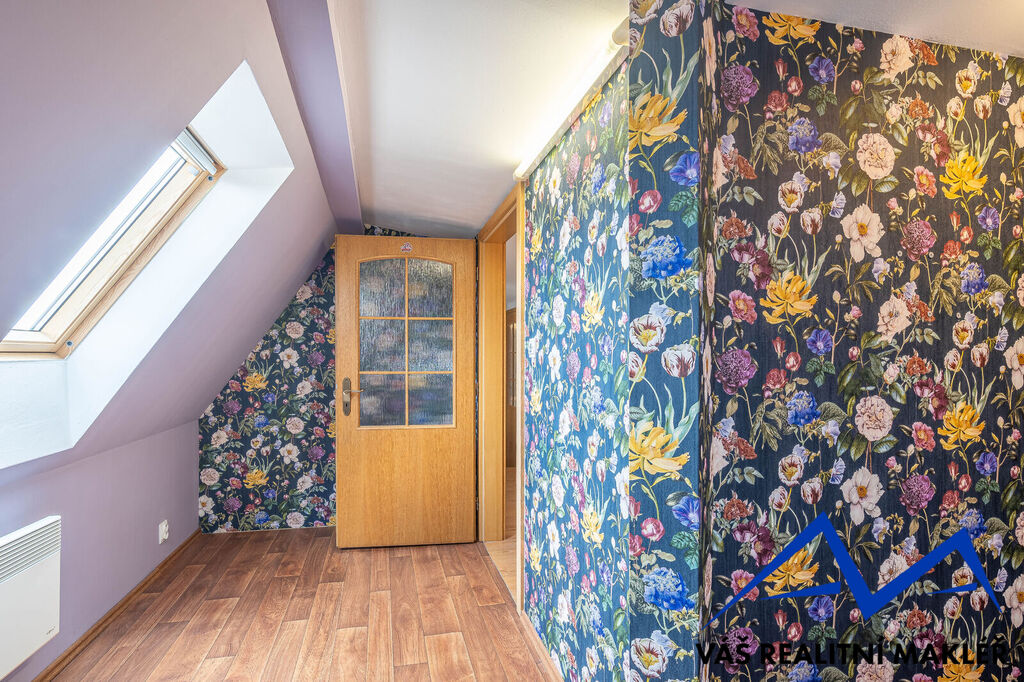 2. patro bytu - obývací pokoj, koupelna s vanou a WC, ložnice, šatna, 2x pokoj, 2x půdní prostor.