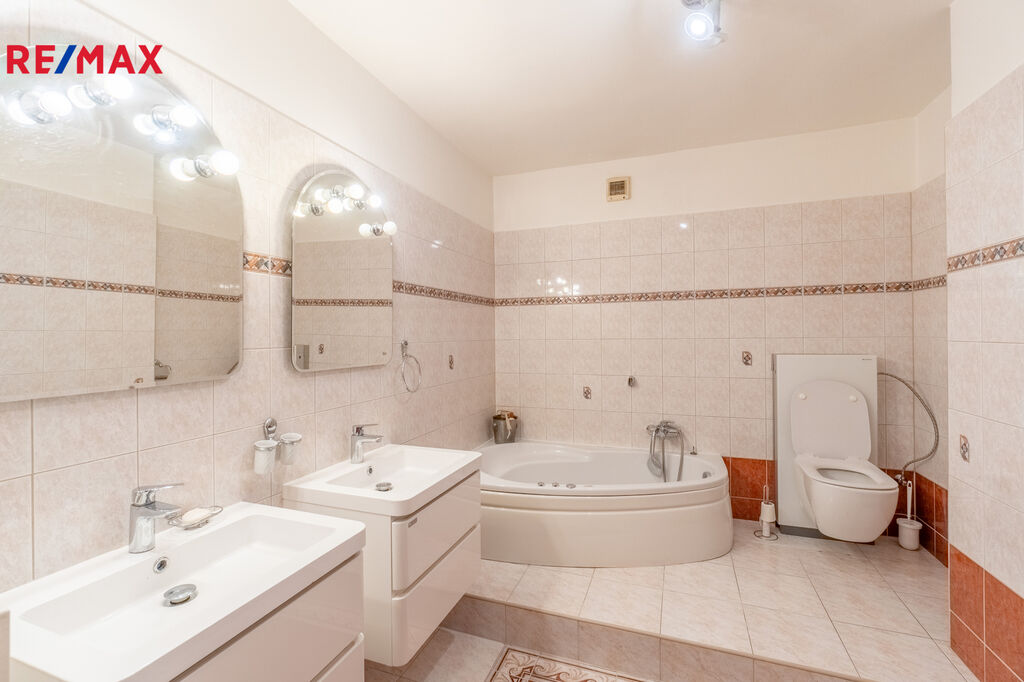 Patro: čtyři ložnice, prostorná koupelna s rohovou vanou a dvěma umyvadly.