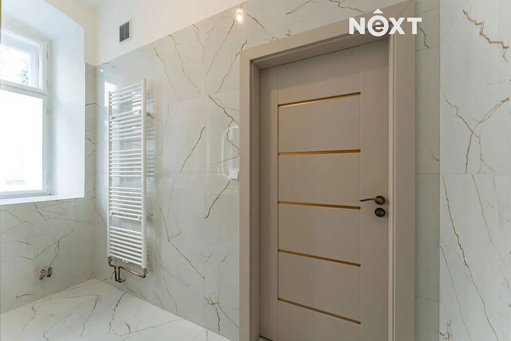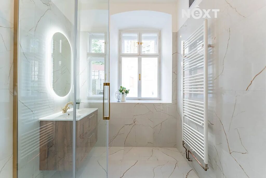 - Dřevěná kastlová okna a vysoké stropy, které dodávají bytu vzdušnost a prostornost