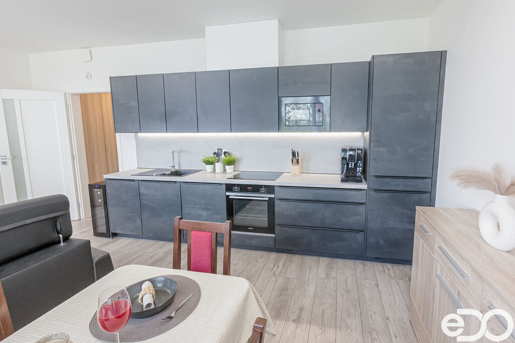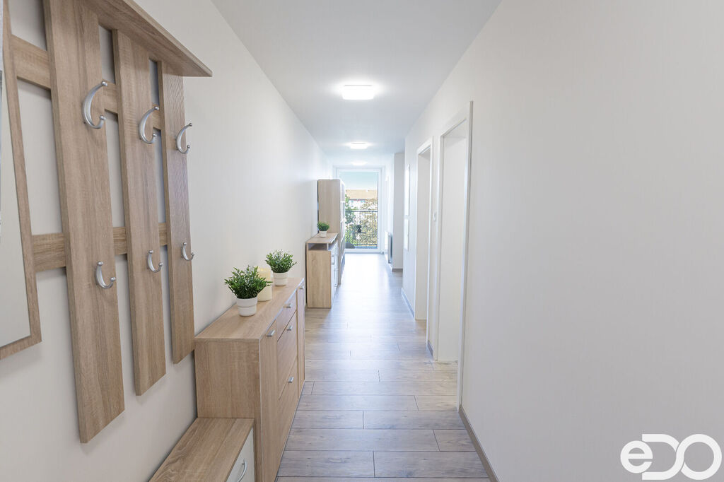 Byt se skládá z dlouhé chodby, obývacího pokoje s kuchyňským koutem, dalších dvou pokojů, koupelny s vanou i sprchovým koutem, samostatným WC s umyvadlem a rozměrné komory, která může sloužit jako úložný prostor. Jednotka se nabízí nezařízená nábytkem. V nové kuchyni, která je vestavěná na míru se nachází veškeré moderní spotřebiče značky AEG: indukční varná deska s digestoří, elektrická trouba, mikrovlnná trouba, vestavěná myčka a lednice s mrazákem. V komoře je umístěna kombinovaná pračka se sušičkou značky Samsung. Díky plastovým oknům a výborné mezibytové zvukové izolaci je byt velmi tichý, což Vám zajistí poklidné a spokojené bydlení. Podlahy jsou laminátové plovoucí a keramická dlažba, vytápění a ohřev vody pak ústřední (výměníková stanice v budově). Zrekonstruovaný bytový dům se nachází v městské části Strašnice, které jsou klidnou a elegantní čtvrtí nedaleko pražského centra. Okolní prvorepubliková vilová zástavba má svoji atmosféru. V bezprostředním okolí se nachází veškerá občanská vybavenost včetně obchodů, restaurací, škol, školek, polikliniky, divadla a mnoho dalších volnočasových aktivit. K relaxaci a sportovnímu vyžití lze využít bohatou okolní zeleň – Malešický park, přírodní park Smetanka, park Gutovka, Botanickou zahradu Malešice a v neposlední řadě i Hostivařskou přehradu. Výborná dopravní dostupnost do centra města jak autem, tak MHD. Několik kroků od domu se nachází autobusová a tramvajová zastávka, odkud se mimo jiné dostanete i na blízké stanice metra A - Strašnická či Depo Hostivař.
