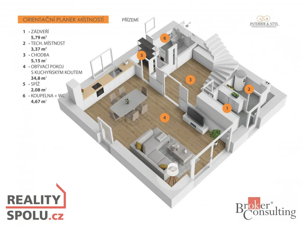 Dům nabízí i dostatek praktických úložných prostor – k dispozici je spíž, prostor pod schody i půda, což ocení zejména rodina s dětmi.