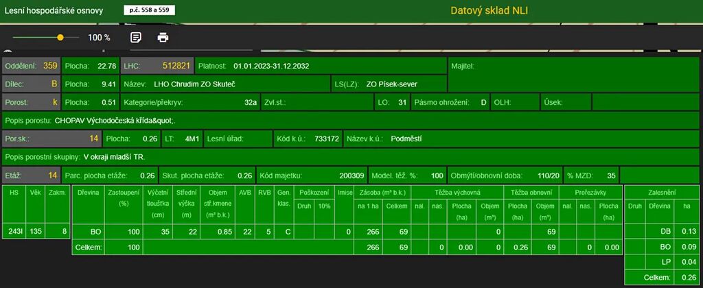 p.č. 559 vedená jako lesní pozemek o celkové výměře 737 m2.