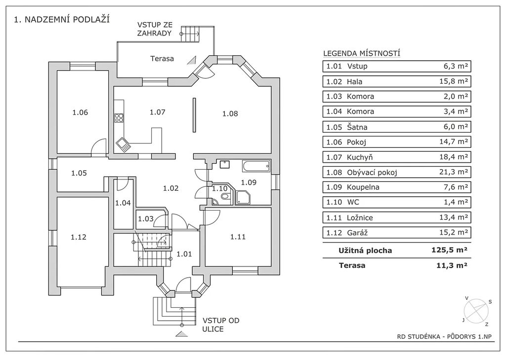 V prvním podlaží se nachází vstupní prostor se schodištěm, prostorná hala, dvě komory, šatna, koupelna, WC, dva pokoje a kuchyň s obývacím pokojem, ze kterého je přístup na terasu. Toto podlaží lze využívat jako samostatnou bytovou jednotku 3+kk o užitné ploše 119 m².