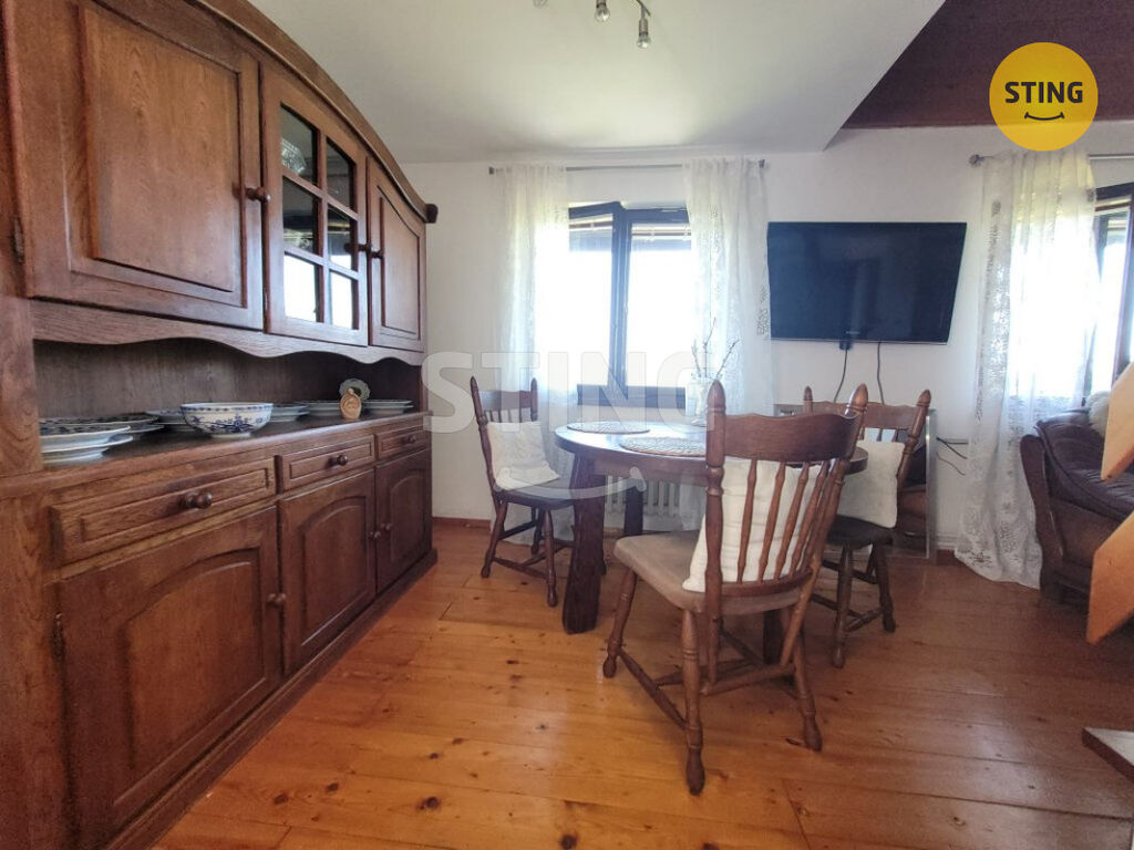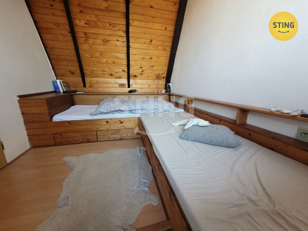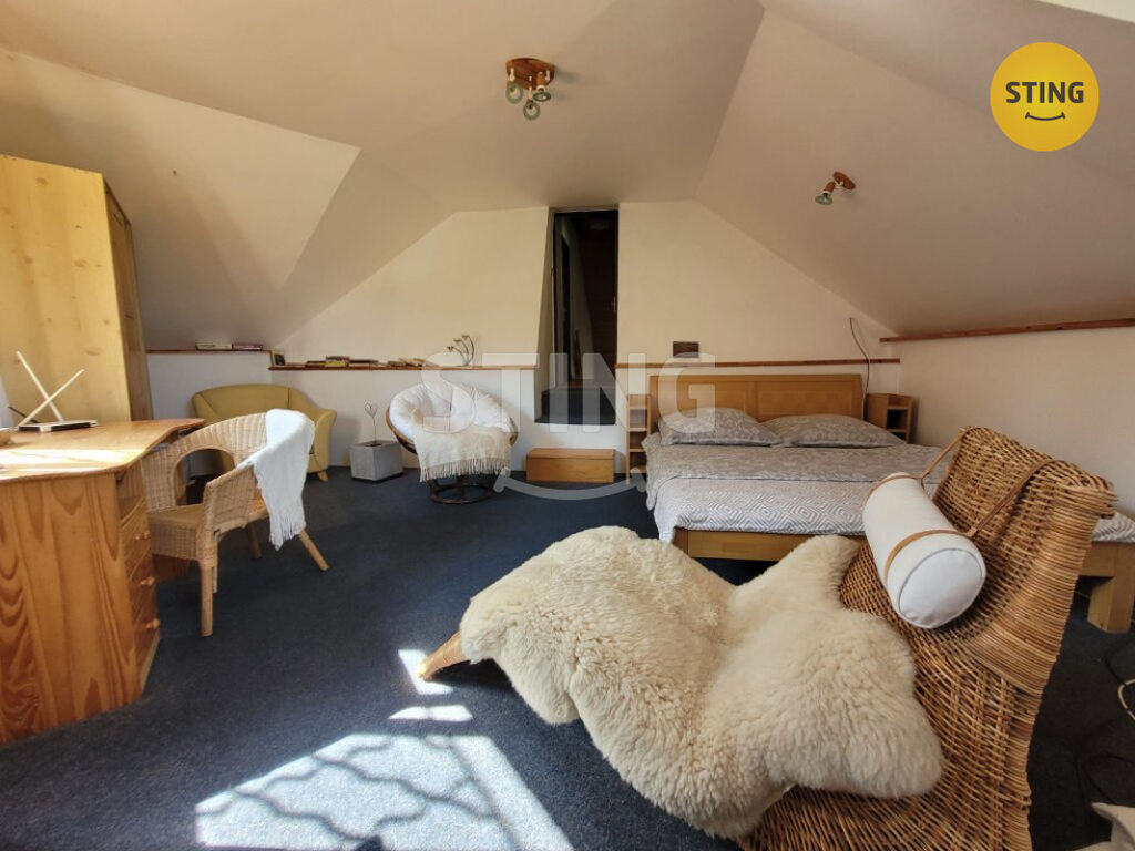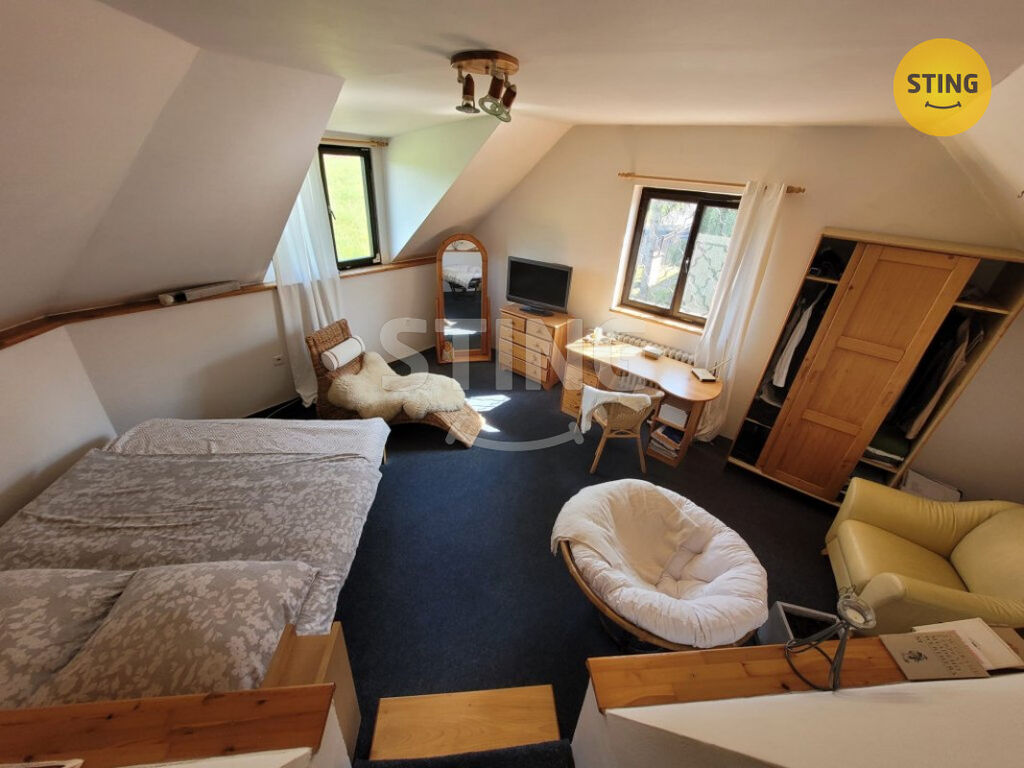 Dům nabízí v obývacím pokoji posezení u krbových kamen, který zároveň vytopí prostor. Dřevěnými schody se dostaneme do spacího prostoru, kde je úžasný výhled na hory a do krajiny. Ve dvou pojících se nachází spaní pro 5 lidí. Dále nad garáží vznikla dostavba a tento krásný prostor nabízí ložnici s relaxační zónou a spaním pro další 2 lidí.