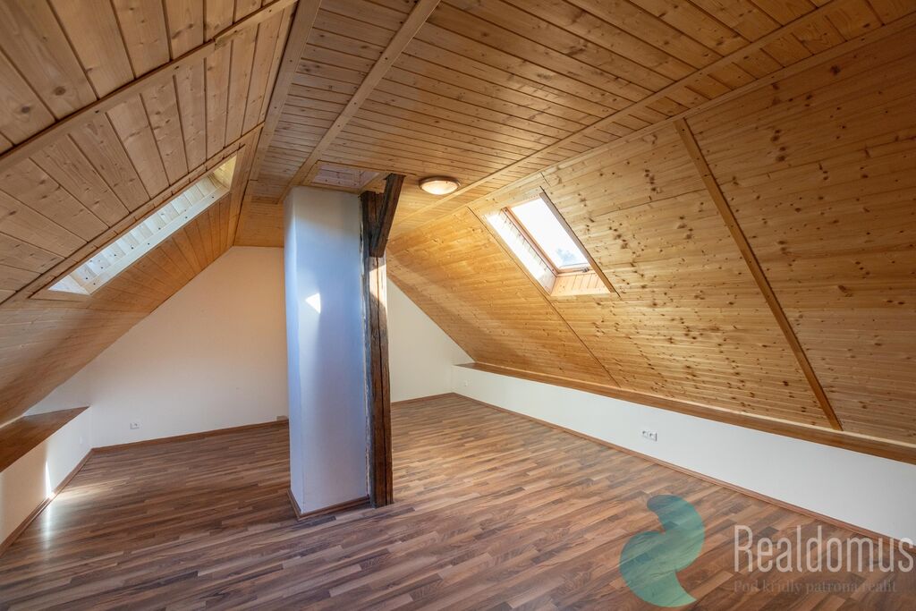 Po venkovních schodech vystoupáte do nově dokončeného obytného podkroví, kde najdete další kuchyňský kout, obývací pokoj, ložnici i koupelnu s vanou a WC – prostor perfektní pro rodinu nebo návštěvy.
