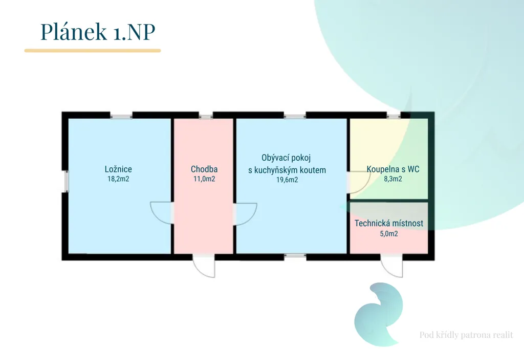 V přízemí vás přivítá vstupní chodba, samostatná ložnice, světlá kuchyň spojená s obývacím pokojem a koupelna s vanou. Srdcem domu je však velká pergola táhnoucí se podél domu – ideální místo pro večerní posezení s rodinou či přáteli.