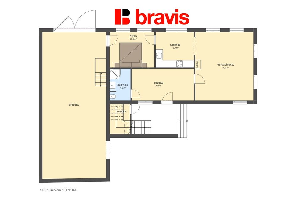 Dům je částečně podsklepený. Součástí stavby je stodola o ploše 108 m2.