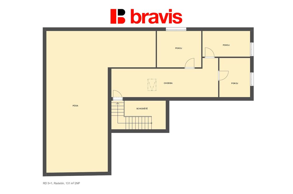 V podkroví, do kterého se dostanete venkovním schodištěm, je velká chodba a 3 pokoje.