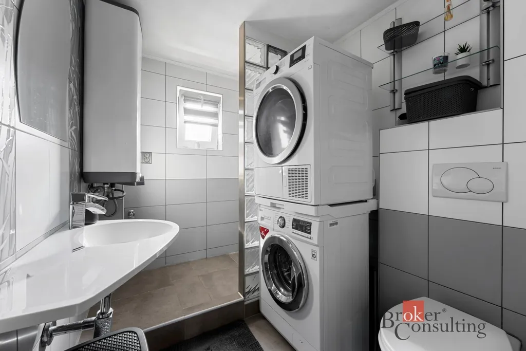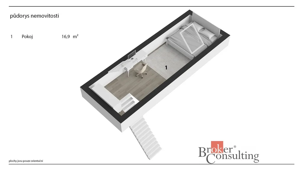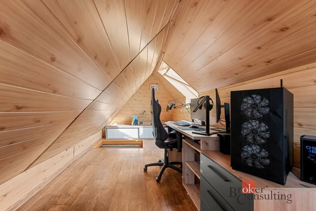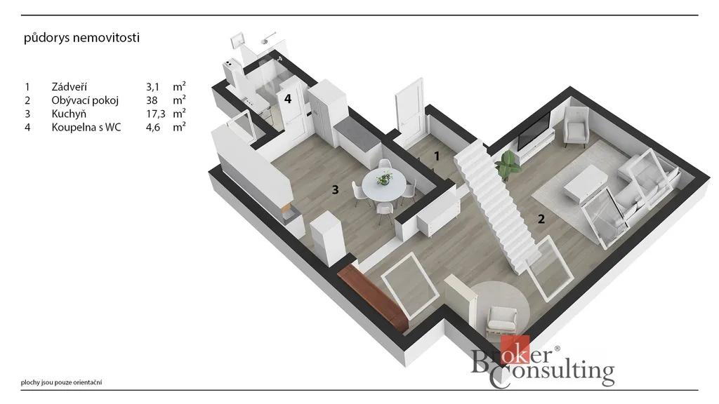 Dispozice bytu: Po vstupu do bytu vás přivítá zádveří (3,11 m²), které navazuje na prostorný obývací pokoj (38 m²) a přímým vstupem do podkroví (16,9 m²). Z kuchyně (17,3 m²) je přístupná moderní koupelna se sprchovým koutem a WC (4,6 m²).