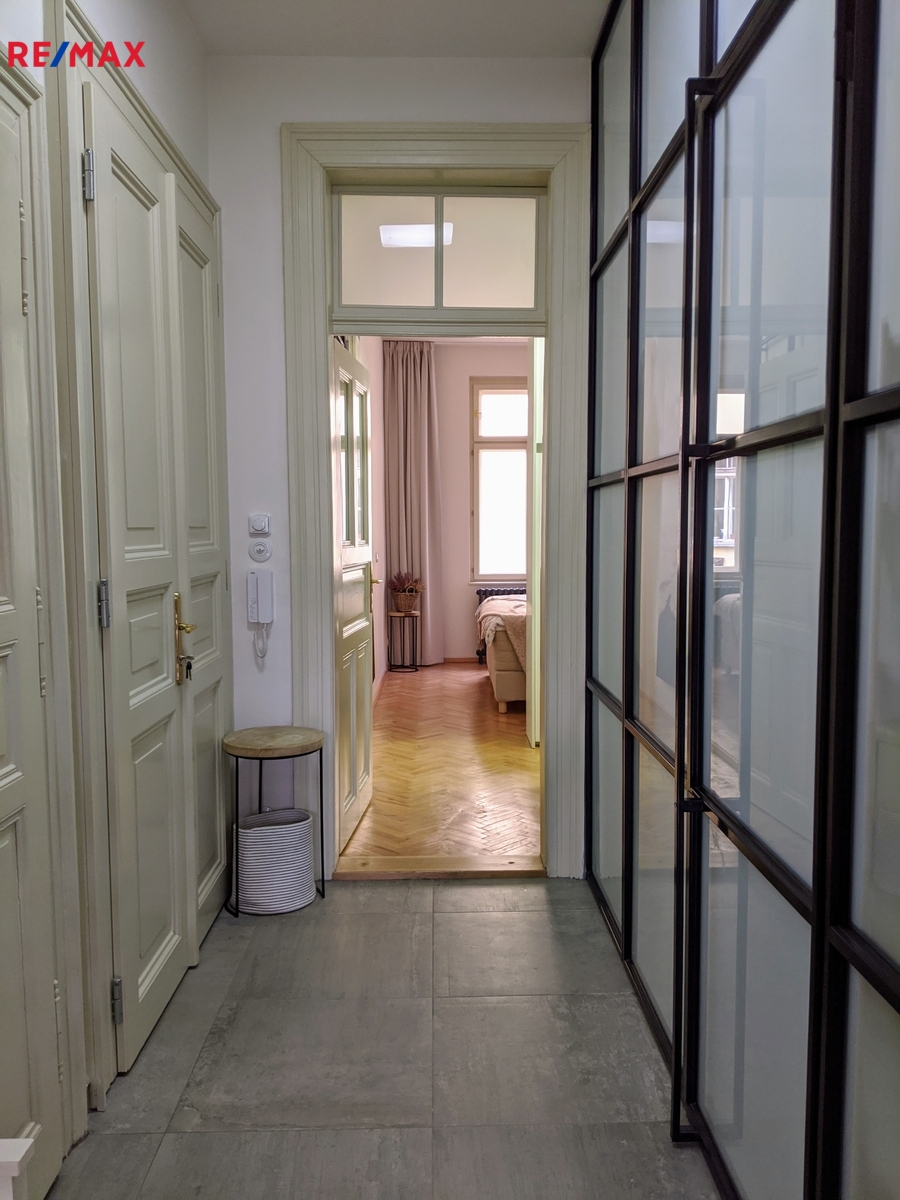 Byt se nachází ve 2. patře zrekonstruovaném činžovním domě z počátku 20. století, který si dodnes zachovává historický šarm i architektonické detaily typické pro tuto dobu. Dům prošel citlivou rekonstrukcí, která spojila elegantní prvorepublikový styl s moderním komfortem.