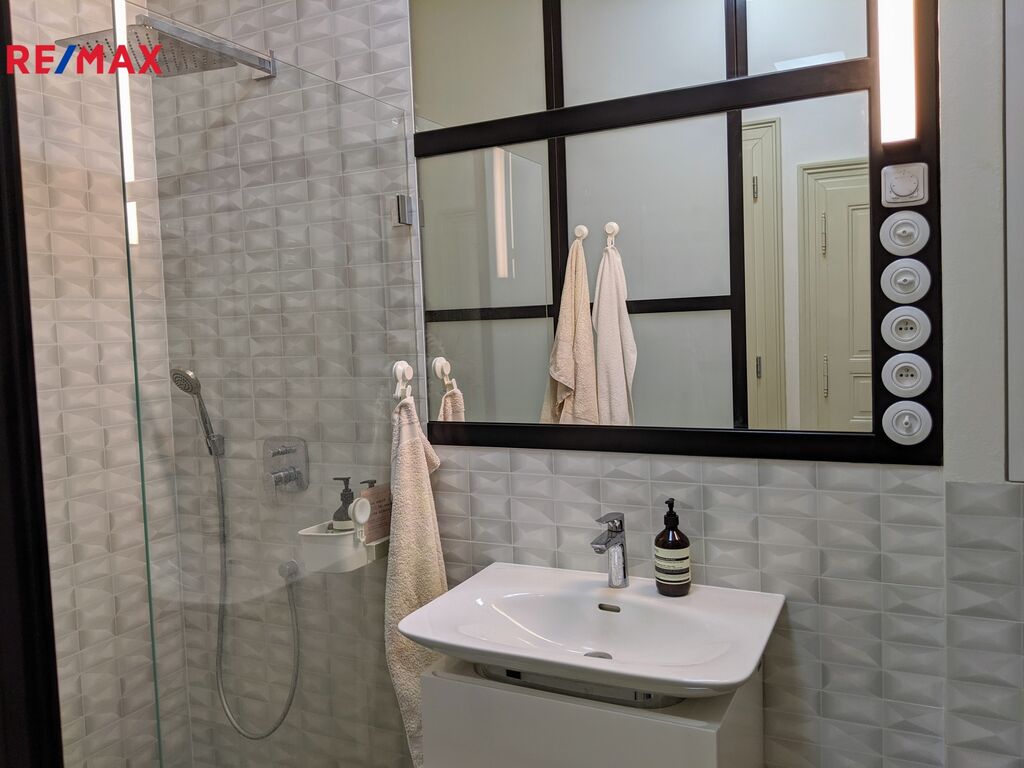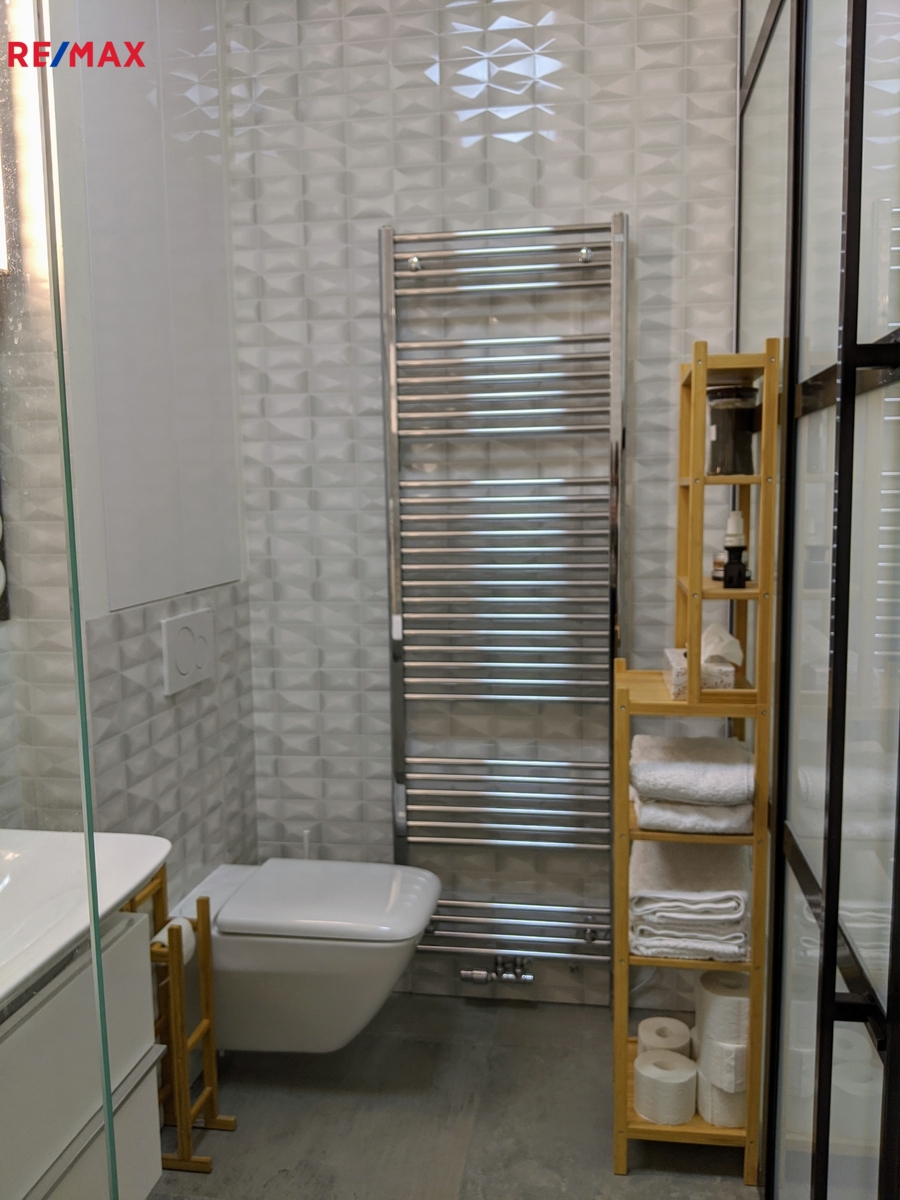 - elegantní koupelna s toaletou a se sprchovým koutem vybavená pračkou