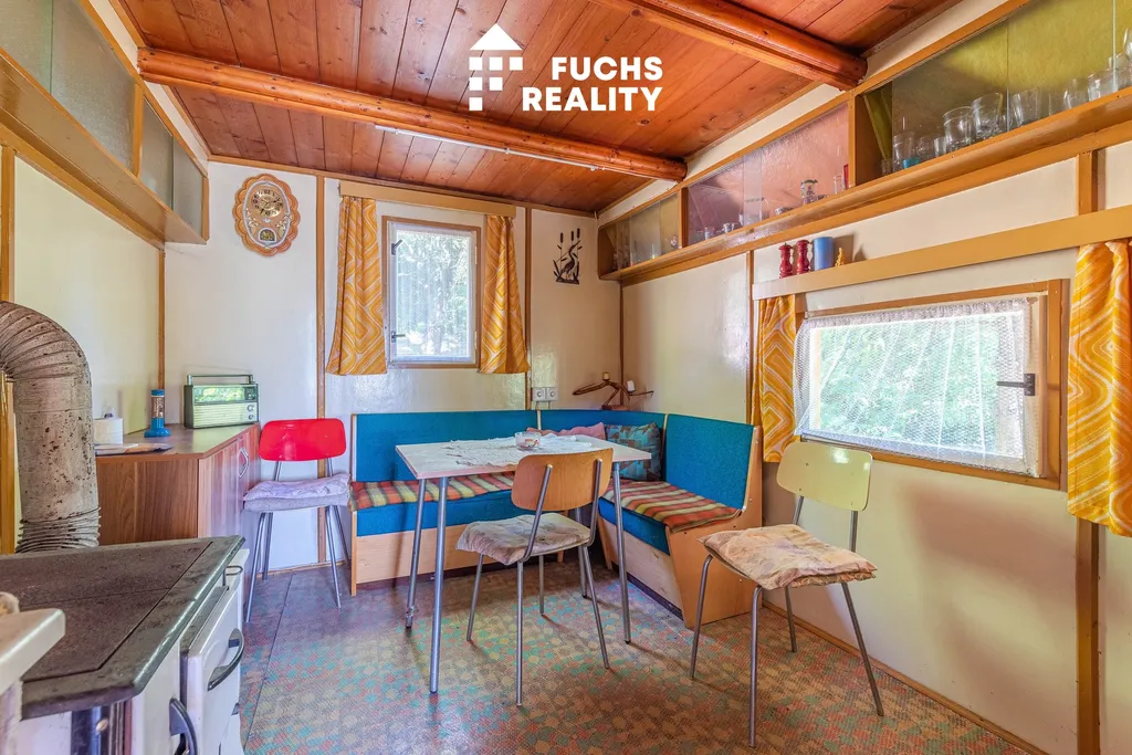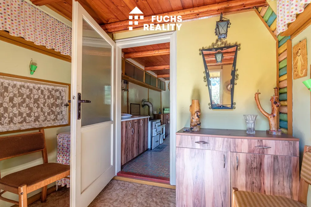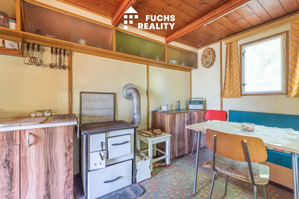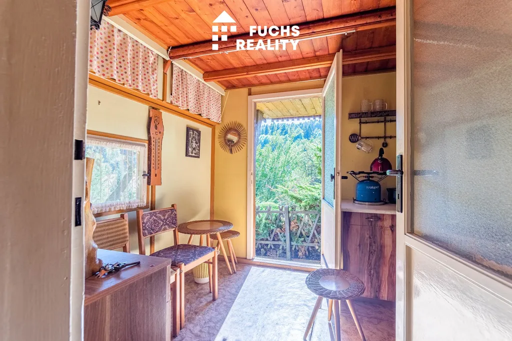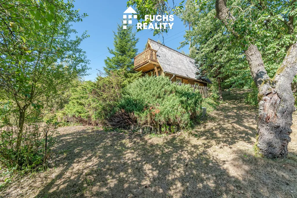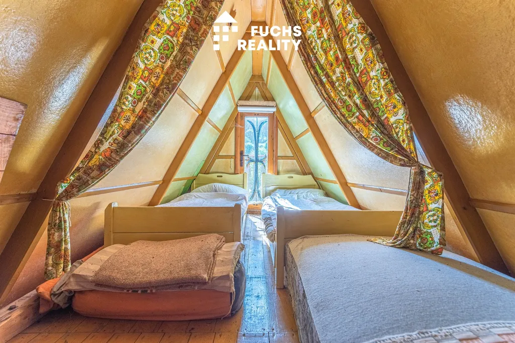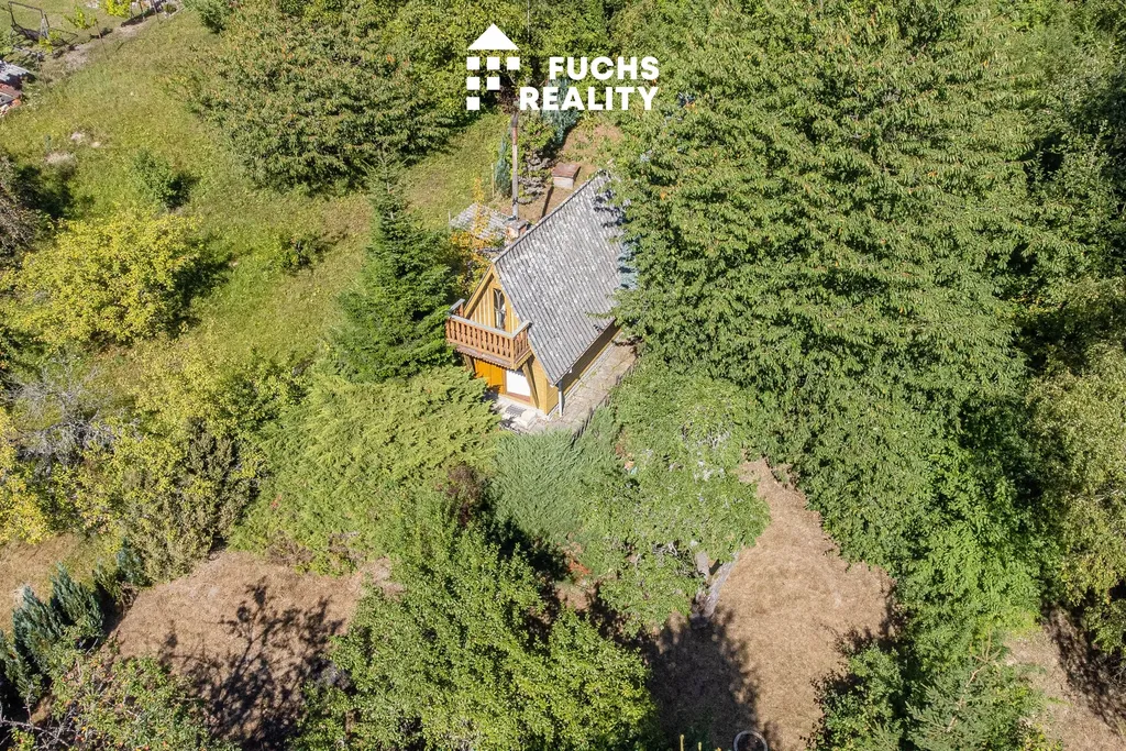 Dispozice chaty zahrnuje zádveří, obytnou místnost s kuchyňským koutem a podkroví s balkonem, odkud je krásný výhled do okolní přírody. Nechybí ani sklep, kolna a suché WC. Na pozemku je přípojka a rozvod obecního vodovodu, elektřina se nachází na hranici pozemku s možností napojení.