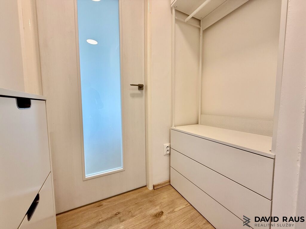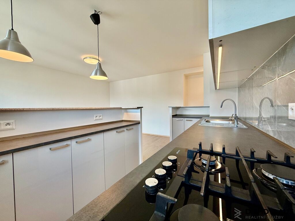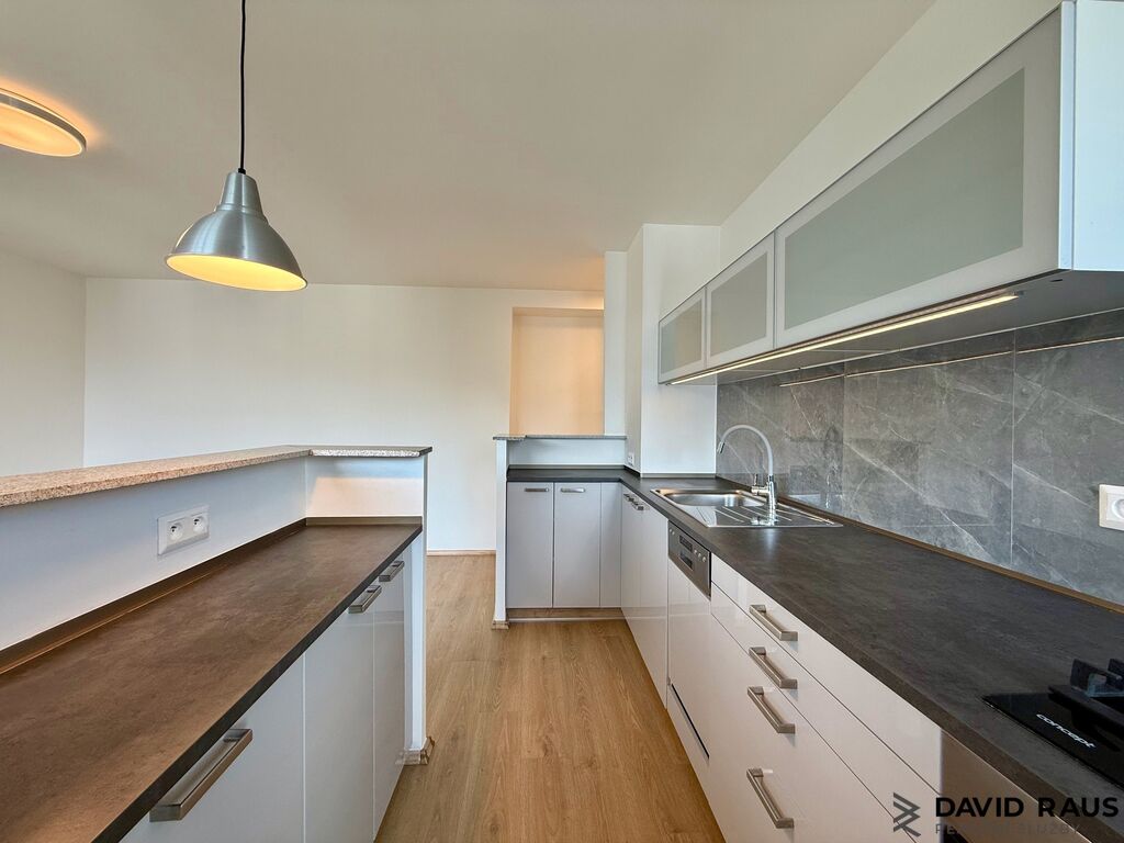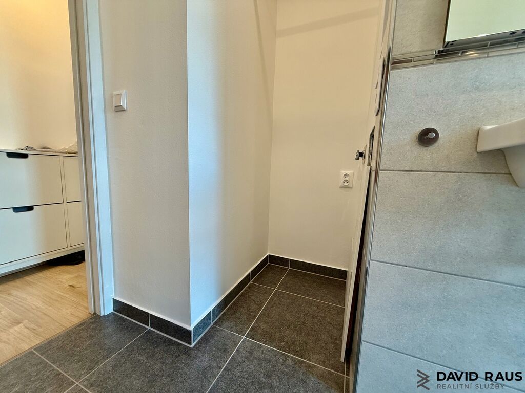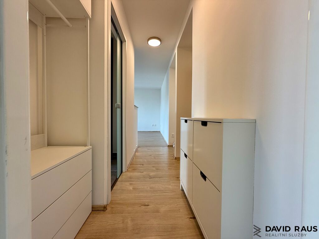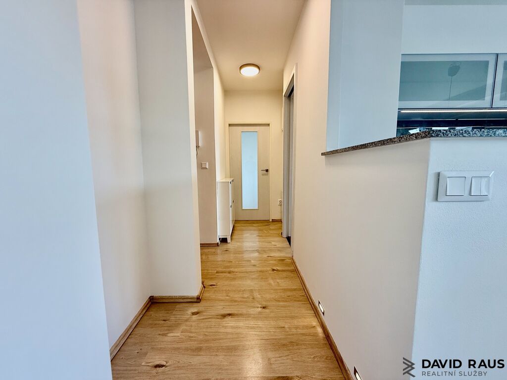 Dispozice bytové jednotky: Po vstupu do bytu se nachází chodba s botníkem a vestavěnou šatní skříní. Z chodby se plynule vstupuje do prostorného obývacího pokoje s moderním kuchyňským koutem. Kuchyňská linka je vybavena praktickým ostrůvkem, který přirozeně odděluje kuchyň od obývací části. Další místnost tvoří samostatný pokoj, který lze využít jako ložnici nebo pracovnu. Po levé straně od vstupu se nachází koupelna se sprchovým koutem a toaletou se vstupem na prostorný balkon.