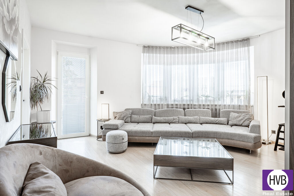 Dispozice - obývací pokoj z plně vybaveným kuchyňským koutem, pět obytných místností, koupelna s vanou, sprchovým koutem a WC, samostatná toaleta.